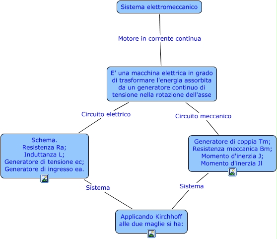 Questa Cmap, creata con IHMC CmapTools, contiene informazioni relative a: Sistema elettromeccanico, E' una macchina elettrica in grado di trasformare l'energia assorbita da un generatore continuo di tensione nella rotazione dell'asse Circuito meccanico Generatore di coppia Tm; Resistenza meccanica Bm; Momento d'inerzia J; Momento d'inerzia Jl, Schema. Resistenza Ra; Induttanza L; Generatore di tensione ec; Generatore di ingresso ea. Sistema Applicando Kirchhoff alle due maglie si ha:, Generatore di coppia Tm; Resistenza meccanica Bm; Momento d'inerzia J; Momento d'inerzia Jl Sistema Applicando Kirchhoff alle due maglie si ha:, Sistema elettromeccanico Motore in corrente continua E' una macchina elettrica in grado di trasformare l'energia assorbita da un generatore continuo di tensione nella rotazione dell'asse, E' una macchina elettrica in grado di trasformare l'energia assorbita da un generatore continuo di tensione nella rotazione dell'asse Circuito elettrico Schema. Resistenza Ra; Induttanza L; Generatore di tensione ec; Generatore di ingresso ea.
