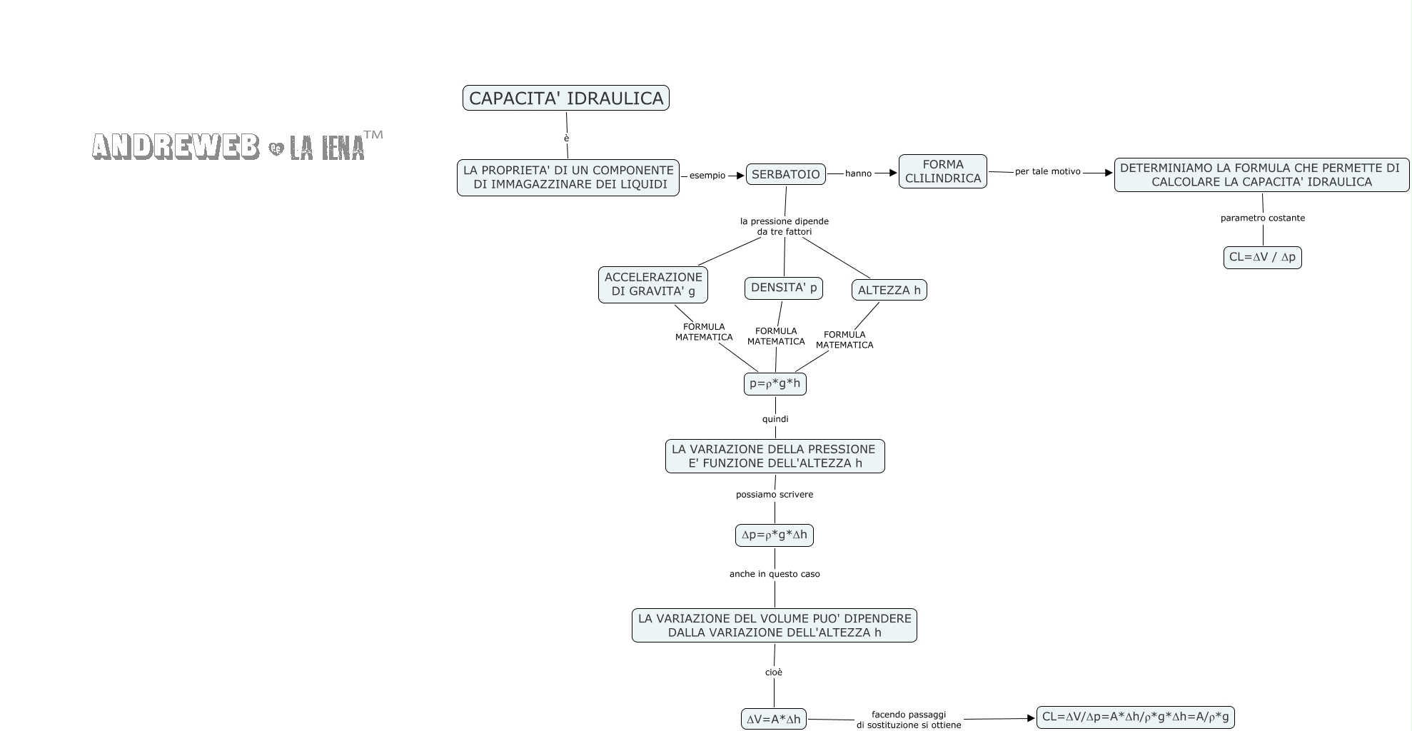 Questa Cmap, creata con IHMC CmapTools, contiene informazioni relative a: Capacità idraulica, SERBATOIO la pressione dipende da tre fattori ACCELERAZIONE DI GRAVITA' g, ALTEZZA h FORMULA MATEMATICA p=ρ*g*h, ACCELERAZIONE DI GRAVITA' g FORMULA MATEMATICA p=ρ*g*h, CAPACITA' IDRAULICA è LA PROPRIETA' DI UN COMPONENTE DI IMMAGAZZINARE DEI LIQUIDI, p=ρ*g*h quindi LA VARIAZIONE DELLA PRESSIONE E' FUNZIONE DELL'ALTEZZA h, SERBATOIO la pressione dipende da tre fattori DENSITA' p, SERBATOIO hanno FORMA CLILINDRICA, DETERMINIAMO LA FORMULA CHE PERMETTE DI CALCOLARE LA CAPACITA' IDRAULICA parametro costante CL=ΔV / Δp, DENSITA' p FORMULA MATEMATICA p=ρ*g*h, ΔV=A*Δh facendo passaggi di sostituzione si ottiene CL=ΔV/Δp=A*Δh/ρ*g*Δh=A/ρ*g, SERBATOIO la pressione dipende da tre fattori ALTEZZA h, LA PROPRIETA' DI UN COMPONENTE DI IMMAGAZZINARE DEI LIQUIDI esempio SERBATOIO, FORMA CLILINDRICA per tale motivo DETERMINIAMO LA FORMULA CHE PERMETTE DI CALCOLARE LA CAPACITA' IDRAULICA, LA VARIAZIONE DEL VOLUME PUO' DIPENDERE DALLA VARIAZIONE DELL'ALTEZZA h cioè ΔV=A*Δh, Δp=ρ*g*Δh anche in questo caso LA VARIAZIONE DEL VOLUME PUO' DIPENDERE DALLA VARIAZIONE DELL'ALTEZZA h, LA VARIAZIONE DELLA PRESSIONE E' FUNZIONE DELL'ALTEZZA h possiamo scrivere Δp=ρ*g*Δh