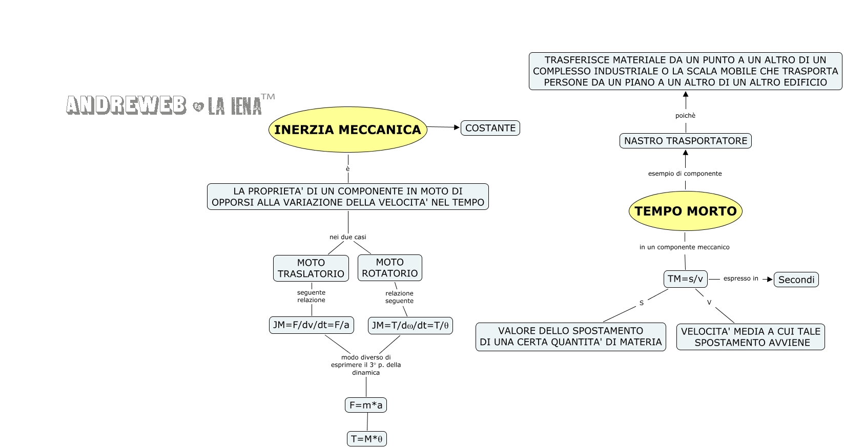 Questa Cmap, creata con IHMC CmapTools, contiene informazioni relative a: Inerzia Meccanica e Tempo Morto, TM=s/v V VELOCITA' MEDIA A CUI TALE SPOSTAMENTO AVVIENE, INERZIA MECCANICA ???? COSTANTE, MOTO TRASLATORIO seguente relazione JM=F/dv/dt=F/a, JM=T/dω/dt=T/θ modo diverso di esprimere il 3° p. della dinamica F=m*a, TEMPO MORTO esempio di componente NASTRO TRASPORTATORE, JM=F/dv/dt=F/a modo diverso di esprimere il 3° p. della dinamica F=m*a, LA PROPRIETA' DI UN COMPONENTE IN MOTO DI OPPORSI ALLA VARIAZIONE DELLA VELOCITA' NEL TEMPO nei due casi MOTO TRASLATORIO, TEMPO MORTO in un componente meccanico TM=s/v, INERZIA MECCANICA è LA PROPRIETA' DI UN COMPONENTE IN MOTO DI OPPORSI ALLA VARIAZIONE DELLA VELOCITA' NEL TEMPO, TM=s/v espresso in Secondi, F=m*a ???? T=M*θ, MOTO ROTATORIO relazione seguente JM=T/dω/dt=T/θ, NASTRO TRASPORTATORE poichè TRASFERISCE MATERIALE DA UN PUNTO A UN ALTRO DI UN COMPLESSO INDUSTRIALE O LA SCALA MOBILE CHE TRASPORTA PERSONE DA UN PIANO A UN ALTRO DI UN ALTRO EDIFICIO, LA PROPRIETA' DI UN COMPONENTE IN MOTO DI OPPORSI ALLA VARIAZIONE DELLA VELOCITA' NEL TEMPO nei due casi MOTO ROTATORIO, TM=s/v S VALORE DELLO SPOSTAMENTO DI UNA CERTA QUANTITA' DI MATERIA