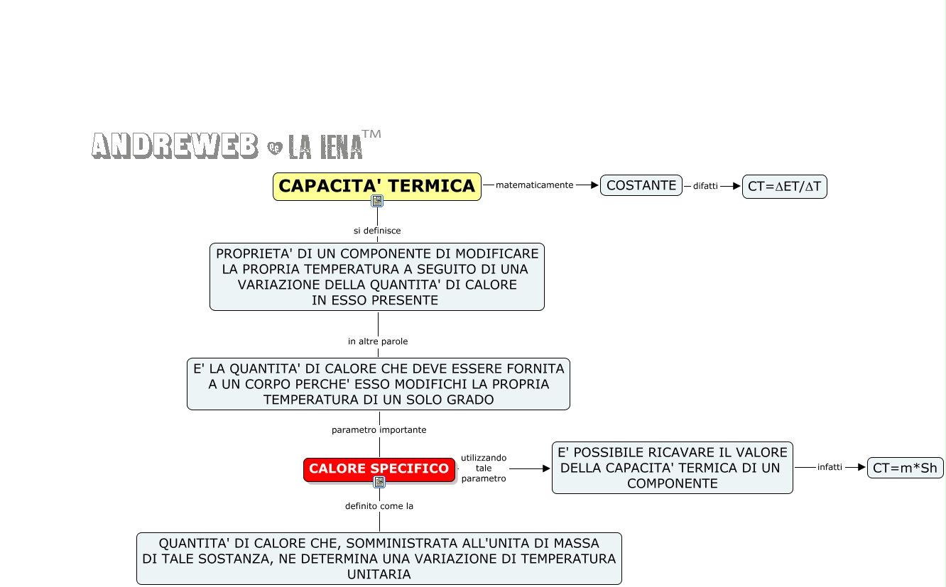 Questa Cmap, creata con IHMC CmapTools, contiene informazioni relative a: Capacità Termica, CAPACITA' TERMICA si definisce PROPRIETA' DI UN COMPONENTE DI MODIFICARE LA PROPRIA TEMPERATURA A SEGUITO DI UNA VARIAZIONE DELLA QUANTITA' DI CALORE IN ESSO PRESENTE, E' POSSIBILE RICAVARE IL VALORE DELLA CAPACITA' TERMICA DI UN COMPONENTE infatti CT=m*Sh, CAPACITA' TERMICA matematicamente COSTANTE, CALORE SPECIFICO definito come la QUANTITA' DI CALORE CHE, SOMMINISTRATA ALL'UNITA DI MASSA DI TALE SOSTANZA, NE DETERMINA UNA VARIAZIONE DI TEMPERATURA UNITARIA, CALORE SPECIFICO utilizzando tale parametro E' POSSIBILE RICAVARE IL VALORE DELLA CAPACITA' TERMICA DI UN COMPONENTE, E' LA QUANTITA' DI CALORE CHE DEVE ESSERE FORNITA A UN CORPO PERCHE' ESSO MODIFICHI LA PROPRIA TEMPERATURA DI UN SOLO GRADO parametro importante CALORE SPECIFICO, COSTANTE difatti CT=ΔET/ΔT, PROPRIETA' DI UN COMPONENTE DI MODIFICARE LA PROPRIA TEMPERATURA A SEGUITO DI UNA VARIAZIONE DELLA QUANTITA' DI CALORE IN ESSO PRESENTE in altre parole E' LA QUANTITA' DI CALORE CHE DEVE ESSERE FORNITA A UN CORPO PERCHE' ESSO MODIFICHI LA PROPRIA TEMPERATURA DI UN SOLO GRADO