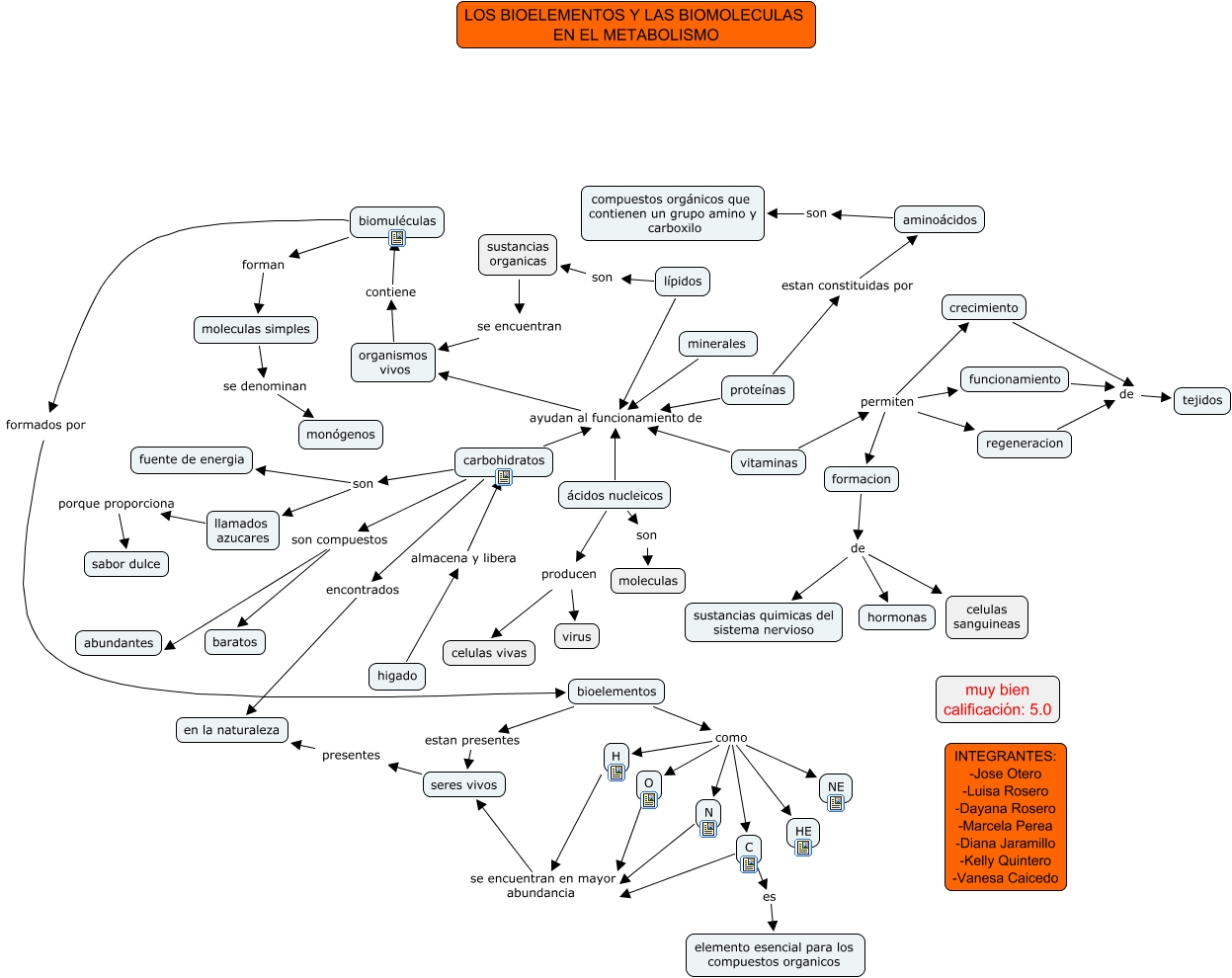Este Cmap, tiene información relacionada con: BIOELEMENTOS Y BIOMOLECULAS, carbohidratos ayudan al funcionamiento de organismos vivos, ácidos nucleicos producen virus, O se encuentran en mayor abundancia seres vivos, minerales ayudan al funcionamiento de organismos vivos, carbohidratos son fuente de energia, ácidos nucleicos producen celulas vivas, ácidos nucleicos son moleculas, funcionamiento de tejidos, moleculas simples se denominan monógenos, bioelementos estan presentes seres vivos, bioelementos como N, regeneracion de tejidos, vitaminas permiten funcionamiento, proteínas estan constituidas por aminoácidos, vitaminas permiten formacion, seres vivos presentes en la naturaleza, aminoácidos son compuestos orgánicos que contienen un grupo amino y carboxilo, biomuléculas forman moleculas simples, biomuléculas formados por bioelementos, formacion de sustancias quimicas del sistema nervioso