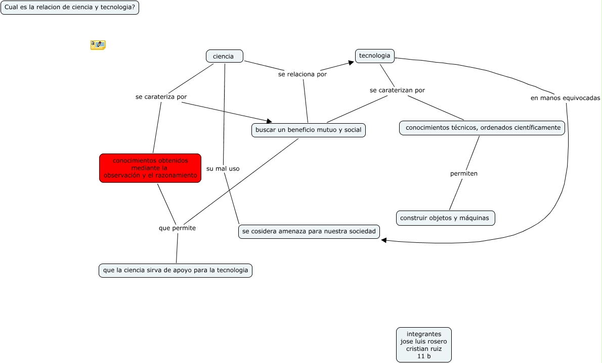 Este Cmap, tiene información relacionada con: cristian ruiz y jose rosero, conocimientos técnicos, ordenados científicamente permiten construir objetos y máquinas, tecnologia se caraterizan por buscar un beneficio mutuo y social, ciencia se relaciona por tecnologia, tecnologia se caraterizan por conocimientos técnicos, ordenados científicamente, ciencia se carateriza por buscar un beneficio mutuo y social, buscar un beneficio mutuo y social que permite que la ciencia sirva de apoyo para la tecnologia, tecnologia en manos equivocadas se cosidera amenaza para nuestra sociedad, ciencia se relaciona por buscar un beneficio mutuo y social, ciencia su mal uso se cosidera amenaza para nuestra sociedad, conocimientos obtenidos mediante la observación y el razonamiento que permite que la ciencia sirva de apoyo para la tecnologia, ciencia se carateriza por conocimientos obtenidos mediante la observación y el razonamiento