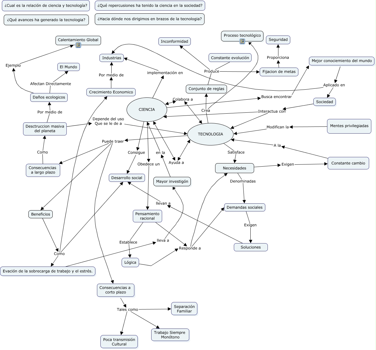 Este Cmap, tiene información relacionada con: ciencia y tecnologia, Daños ecologicos Ejemplo Calentamiento Global, Soluciones llevan a Desarrollo social, Desctruccion masiva del planeta Por medio de Daños ecologicos, Desctruccion masiva del planeta Depende del uso Que se le de a TECNOLOGIA, Lógica Responde a Demandas sociales, TECNOLOGIA Crea Proceso tecnológico, Daños ecologicos Afectan Directamente El Mundo, Mejor conociemiento del mundo Aplicado en Industrias, Conjunto de reglas Produce Inconformidad, Evación de la sobrecarga de trabajo y el estrés. lleva a Mayor investigón, Beneficios Como Crecimiento Economico, Beneficios Como Evación de la sobrecarga de trabajo y el estrés., Constante evolución Produce Fijacion de metas, Mayor investigón en la CIENCIA, Pensamiento racional Responde a Necesidades, Necesidades Exigen Constante cambio, Sociedad Interactua con TECNOLOGIA, Consecuencias a corto plazo Tales como Poca transmisión Cultural, TECNOLOGIA Crea Conjunto de reglas, Sociedad Interactua con CIENCIA