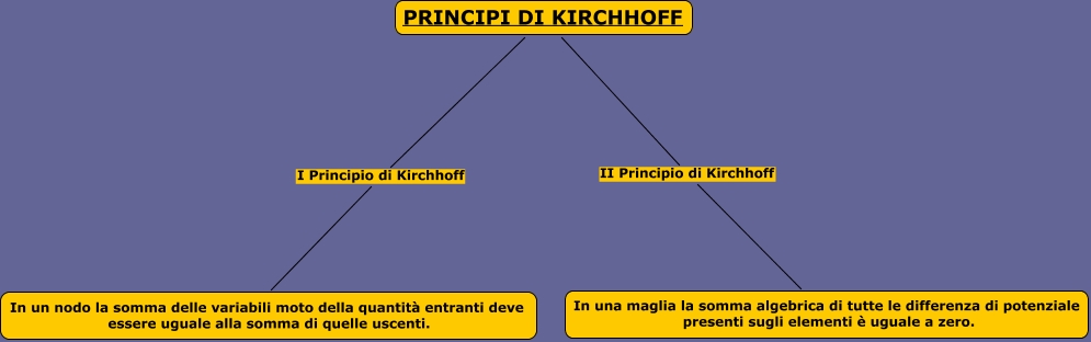 Questa Cmap, creata con IHMC CmapTools, contiene informazioni relative a: PRINCIPI DI KIRCHHOFF, PRINCIPI DI KIRCHHOFF I Principio di Kirchhoff In un nodo la somma delle variabili moto della quantità entranti deve essere uguale alla somma di quelle uscenti., PRINCIPI DI KIRCHHOFF II Principio di Kirchhoff In una maglia la somma algebrica di tutte le differenza di potenziale presenti sugli elementi è uguale a zero.