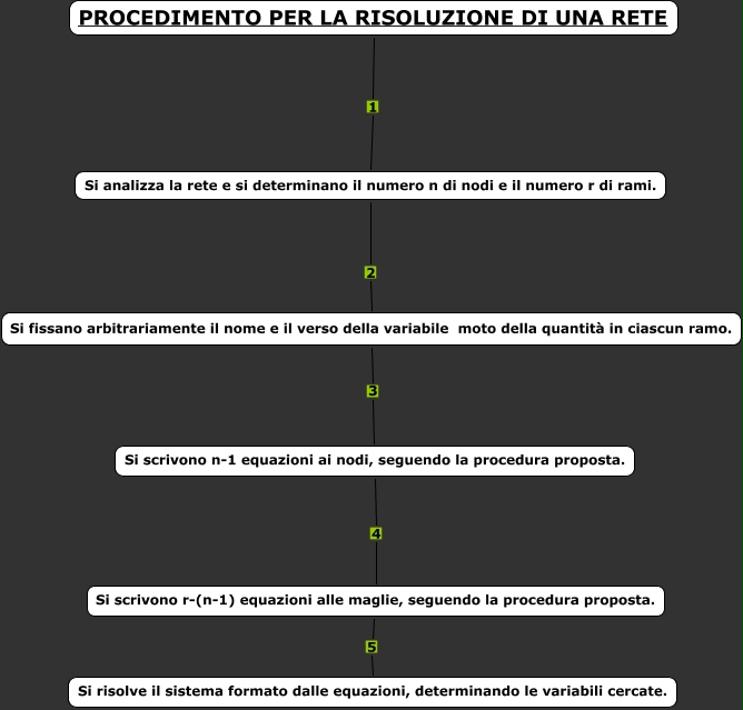 Questa Cmap, creata con IHMC CmapTools, contiene informazioni relative a: PROCEDIMENTO PER LA RISOLUZIONE DI UNA RETE, Si analizza la rete e si determinano il numero n di nodi e il numero r di rami. 2 Si fissano arbitrariamente il nome e il verso della variabile moto della quantità in ciascun ramo., Si fissano arbitrariamente il nome e il verso della variabile moto della quantità in ciascun ramo. 3 Si scrivono n-1 equazioni ai nodi, seguendo la procedura proposta., Si scrivono n-1 equazioni ai nodi, seguendo la procedura proposta. 4 Si scrivono r-(n-1) equazioni alle maglie, seguendo la procedura proposta., Si scrivono r-(n-1) equazioni alle maglie, seguendo la procedura proposta. 5 Si risolve il sistema formato dalle equazioni, determinando le variabili cercate., PROCEDIMENTO PER LA RISOLUZIONE DI UNA RETE 1 Si analizza la rete e si determinano il numero n di nodi e il numero r di rami.