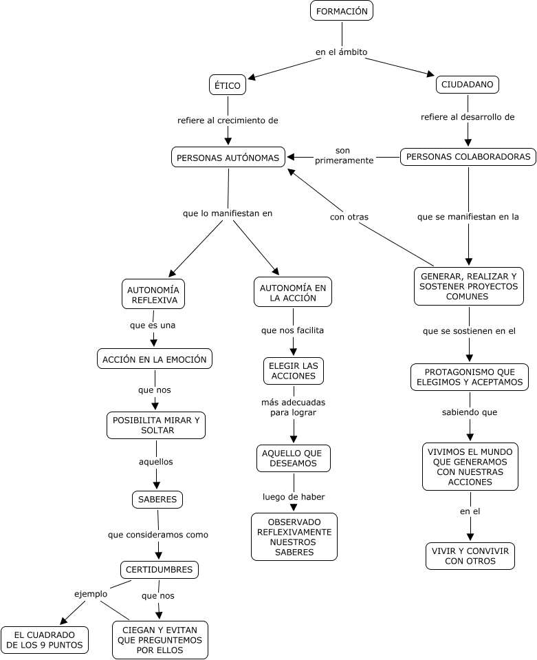 Este Cmap, tiene información relacionada con: FEC 2010, GENERAR, REALIZAR Y SOSTENER PROYECTOS COMUNES que se sostienen en el PROTAGONISMO QUE ELEGIMOS Y ACEPTAMOS, POSIBILITA MIRAR Y SOLTAR aquellos SABERES, ACCIÓN EN LA EMOCIÓN que nos POSIBILITA MIRAR Y SOLTAR, PERSONAS AUTÓNOMAS que lo manifiestan en AUTONOMÍA EN LA ACCIÓN, VIVIMOS EL MUNDO QUE GENERAMOS CON NUESTRAS ACCIONES en el VIVIR Y CONVIVIR CON OTROS, FORMACIÓN en el ámbito ÉTICO, GENERAR, REALIZAR Y SOSTENER PROYECTOS COMUNES con otras PERSONAS AUTÓNOMAS, PERSONAS COLABORADORAS son primeramente PERSONAS AUTÓNOMAS, AQUELLO QUE DESEAMOS luego de haber OBSERVADO REFLEXIVAMENTE NUESTROS SABERES, AUTONOMÍA EN LA ACCIÓN que nos facilita ELEGIR LAS ACCIONES, CERTIDUMBRES que nos CIEGAN Y EVITAN QUE PREGUNTEMOS POR ELLOS, CERTIDUMBRES ejemplo EL CUADRADO DE LOS 9 PUNTOS, AUTONOMÍA REFLEXIVA que es una ACCIÓN EN LA EMOCIÓN, ÉTICO refiere al crecimiento de PERSONAS AUTÓNOMAS, ELEGIR LAS ACCIONES más adecuadas para lograr AQUELLO QUE DESEAMOS, PROTAGONISMO QUE ELEGIMOS Y ACEPTAMOS sabiendo que VIVIMOS EL MUNDO QUE GENERAMOS CON NUESTRAS ACCIONES, SABERES que consideramos como CERTIDUMBRES, CIUDADANO refiere al desarrollo de PERSONAS COLABORADORAS, FORMACIÓN en el ámbito CIUDADANO, PERSONAS AUTÓNOMAS que lo manifiestan en AUTONOMÍA REFLEXIVA