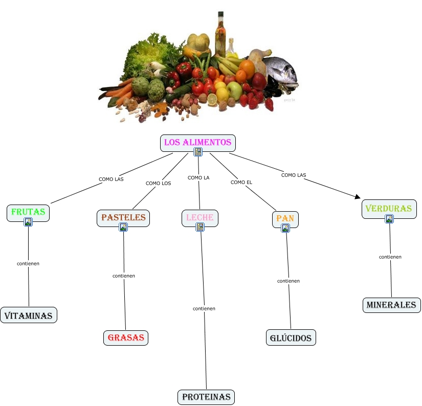 Este Cmap, tiene información relacionada con: LOS ALIMENTOS, LOS ALIMENTOS COMO EL pan, pasteles contienen grasas, LOS ALIMENTOS COMO LOS pasteles, LOS ALIMENTOS COMO LAS FRUTas, FRUTas contienen vitaminas, verduras contienen minerales, LOS ALIMENTOS COMO LA leche, leche contienen proteinas, LOS ALIMENTOS COMO LAS verduras, pan contienen glúcidos