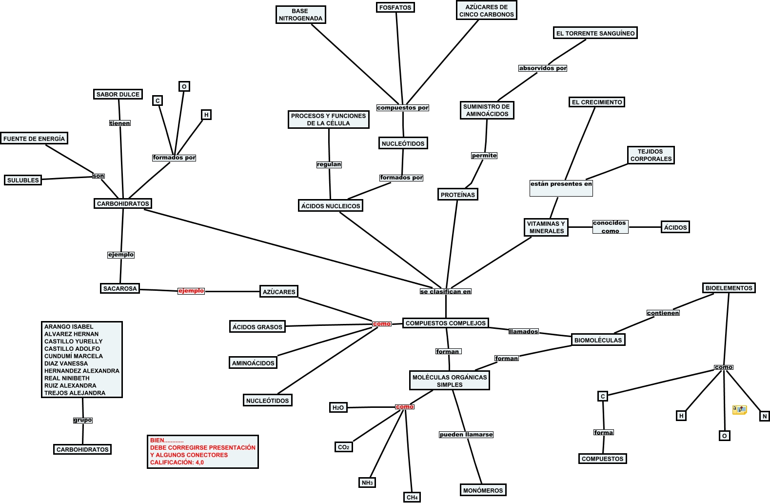 Esse mapa conceitual, produzido no IHMC CmapTools, tem a informação relacionada a: BIOQUÍMICA, C forma COMPUESTOS, MOLÉCULAS ORGÁNICAS SIMPLES como NH3, COMPUESTOS COMPLEJOS como AZÚCARES, CARBOHIDRATOS se clasifican en VITAMINAS Y MINERALES, BIOELEMENTOS como C, CARBOHIDRATOS se clasifican en PROTEÍNAS, CARBOHIDRATOS son SULUBLES, VITAMINAS Y MINERALES están presentes en TEJIDOS CORPORALES, NUCLEÓTIDOS compuestos por BASE NITROGENADA, MOLÉCULAS ORGÁNICAS SIMPLES como CO2, CARBOHIDRATOS se clasifican en COMPUESTOS COMPLEJOS, SUMINISTRO DE AMINOÁCIDOS absorvidos por EL TORRENTE SANGUÍNEO, SACAROSA ejemplo CARBOHIDRATOS, COMPUESTOS COMPLEJOS como ÁCIDOS GRASOS, MOLÉCULAS ORGÁNICAS SIMPLES como H2O, ÁCIDOS NUCLEICOS regulan PROCESOS Y FUNCIONES DE LA CÉLULA, COMPUESTOS COMPLEJOS como AMINOÁCIDOS, CARBOHIDRATOS se clasifican en ÁCIDOS NUCLEICOS, CARBOHIDRATOS son FUENTE DE ENERGÍA, MOLÉCULAS ORGÁNICAS SIMPLES pueden llamarse MONÓMEROS