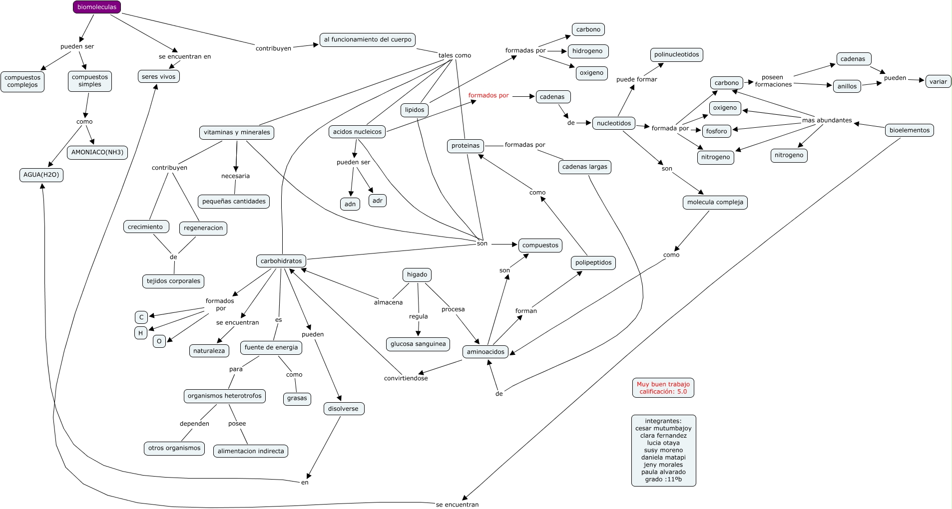 Este Cmap, tiene información relacionada con: 11b cesar, organismos heterotrofos posee alimentacion indirecta, proteinas formadas por cadenas largas, compuestos simples como AMONIACO(NH3), carbohidratos son compuestos, acidos nucleicos son compuestos, al funcionamiento del cuerpo tales como carbohidratos, fuente de energia como grasas, carbono poseen formaciones cadenas, acidos nucleicos pueden ser adn, disolverse en AGUA(H2O), biomoleculas contribuyen al funcionamiento del cuerpo, carbohidratos se encuentran naturaleza, molecula compleja como aminoacidos, bioelementos mas abundantes carbono, bioelementos mas abundantes oxigeno, bioelementos mas abundantes nitrogeno, anillos pueden variar, polipeptidos como proteinas, vitaminas y minerales contribuyen crecimiento, biomoleculas pueden ser compuestos simples