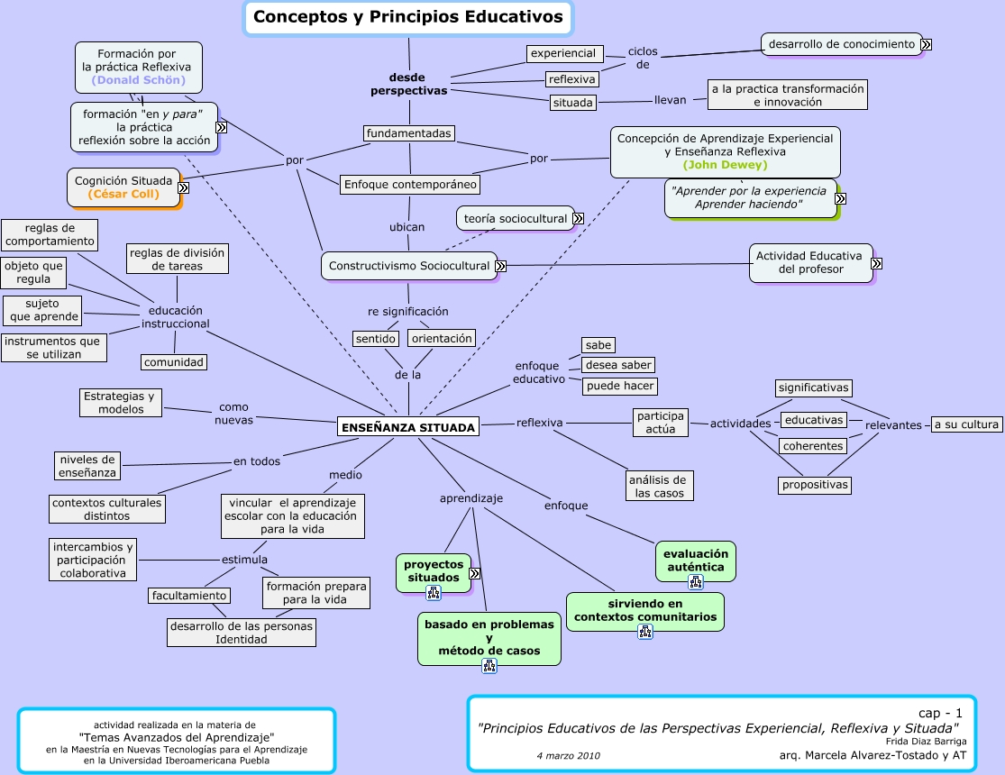 Este Cmap, tiene información relacionada con: Cap-1-Marcela Alvarez-Tostado y AT, ENSEÑANZA SITUADA enfoque evaluación auténtica, la reconstrucción de su práctica, Función tutorial debe definir problema, ENSEÑANZA SITUADA educación instruccional objeto que regula, formación "en y para" la práctica reflexión sobre la acción ???? ENSEÑANZA SITUADA, sentido de la orientación, participa actúa actividades educativas, Cognición Situada (César Coll) por Enfoque contemporáneo, principios educativos educación científica, vincular el aprendizaje escolar con la educación para la vida estimula facultamiento, enseñanza análisis ¿que significa esto?, ENSEÑANZA SITUADA reflexiva participa actúa, interactuen resolver aprendan, deseo de seguir aprendiendo de forma democrática, Formación por la práctica Reflexiva (Donald Schön) proceso exploración, provocar situaciones de incertidumbre y de conflicto de valores, participa actúa actividades coherentes, proporciona ayuda desarrollo de competencias, de pensamiento de forma democrática, ENSEÑANZA SITUADA aprendizaje sirviendo en contextos comunitarios