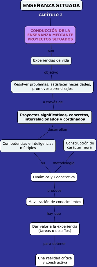 Este Cmap, tiene información relacionada con: CAP.2.PROYECTOS.SITUADOS, Dinámica y Cooperativa produce Movilización de conocimientos, Movilización de conocimientos hay que Dar valor a la experiencia (tareas o desafíos), Construcción de carácter moral metodología Dinámica y Cooperativa, Dar valor a la experiencia (tareas o desafíos) para obtener Una realidad crítica y constructiva, Experiencias de vida objetivo Resolver problemas, satisfacer necesidades, promover aprendizajes, Proyectos significativos, concretos, interrelacionados y cordinados desarrollan Competencias e inteligencias múltiples, Resolver problemas, satisfacer necesidades, promover aprendizajes a través de Proyectos significativos, concretos, interrelacionados y cordinados, CONDUCCIÓN DE LA ENSEÑANZA MEDIANTE PROYECTOS SITUADOS son Experiencias de vida, Competencias e inteligencias múltiples su Dinámica y Cooperativa, CONDUCCIÓN DE LA ENSEÑANZA MEDIANTE PROYECTOS SITUADOS CAPÍTULO 2 ENSEÑANZA SITUADA