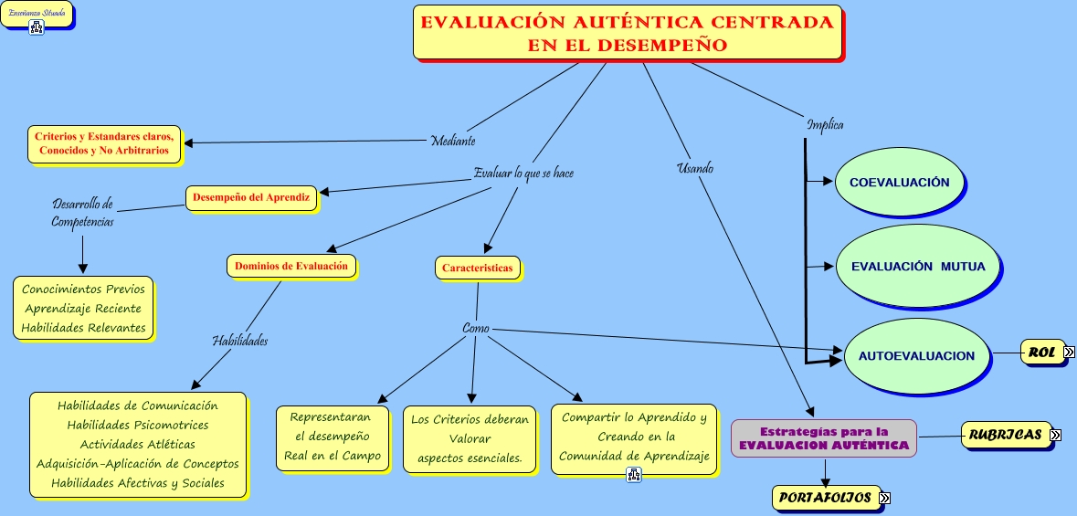 Este Cmap, tiene información relacionada con: 05 EVALUACION AUTENTICA CENTRADA EN EL DESEMPEÑO, Guía de Escala de Evaluación La Rúbrica permitira al Docente Modelar, Retroalimentar los desempeños esperados y en el Alumno ofrecera elementos para la Autoevaluación y Regulación personal del Aprendizaje., EVALUACIÓN AUTÉNTICA CENTRADA EN EL DESEMPEÑO Evaluar lo que se hace Caracteristicas, Desempeño del Aprendiz Desarrollo de Competencias Conocimientos Previos Aprendizaje Reciente Habilidades Relevantes, Estrategías para la EVALUACION AUTÉNTICA RÚBRICAS Reflexión y Autoevaluación, EVALUACIÓN AUTÉNTICA CENTRADA EN EL DESEMPEÑO Evaluar lo que se hace Dominios de Evaluación, Dimensiones Criterios o Indicadores de Calidad y Definición Cualitativa La Rúbrica permitira al Docente Modelar, Retroalimentar los desempeños esperados y en el Alumno ofrecera elementos para la Autoevaluación y Regulación personal del Aprendizaje., Caracteristicas Como Representaran el desempeño Real en el Campo, Se almacena información. Digitalmente en Disco, en Sitios o Paginas Web Busca Construcción de su Identidad y Proyecto de Vida, EVALUACIÓN AUTÉNTICA CENTRADA EN EL DESEMPEÑO Evaluar lo que se hace Desempeño del Aprendiz, EVALUACIÓN AUTÉNTICA CENTRADA EN EL DESEMPEÑO Mediante Criterios y Estandares claros, Conocidos y No Arbitrarios, Estrategías para la EVALUACION AUTÉNTICA RÚBRICAS Guía de Escala de Evaluación, Capacidades de Autorregulación y Reflexión Docente Actividades de Planeación y Preparación El Curriculo, La observación del aula y alumnos, Tutorías, Enseñanza en grupos pequeños y Evaluación de Portafolios., Estrategías para la EVALUACION AUTÉNTICA PORTAFOLIOS Selección o Colección de Trabajos Académicos, Estrategías para la EVALUACION AUTÉNTICA PORTAFOLIOS Portafolio del Docente, Estrategías para la EVALUACION AUTÉNTICA PORTAFOLIOS AUTOEVALUACIÓN DEL APRENDIZAJE, EVALUACIÓN AUTÉNTICA CENTRADA EN EL DESEMPEÑO Usando Estrategías para la EVALUACION AUTÉNTICA, Estrategías para la EVALUACION AUTÉNTICA PORTAFOLIOS Metodos de Carpeta:, Reflexión y Autoevaluación La Rúbrica permitira al Docente Modelar, Retroalimentar los desempeños esperados y en el Alumno ofrecera elementos para la Autoevaluación y Regulación personal del Aprendizaje., AUTOEVALUACION Implica Capacidades de Autorregulación y Reflexión, AUTOEVALUACIÓN DEL APRENDIZAJE proporciona Docente tenga elementos para Evaluar al Estudiante y a la Enseñanza misma.