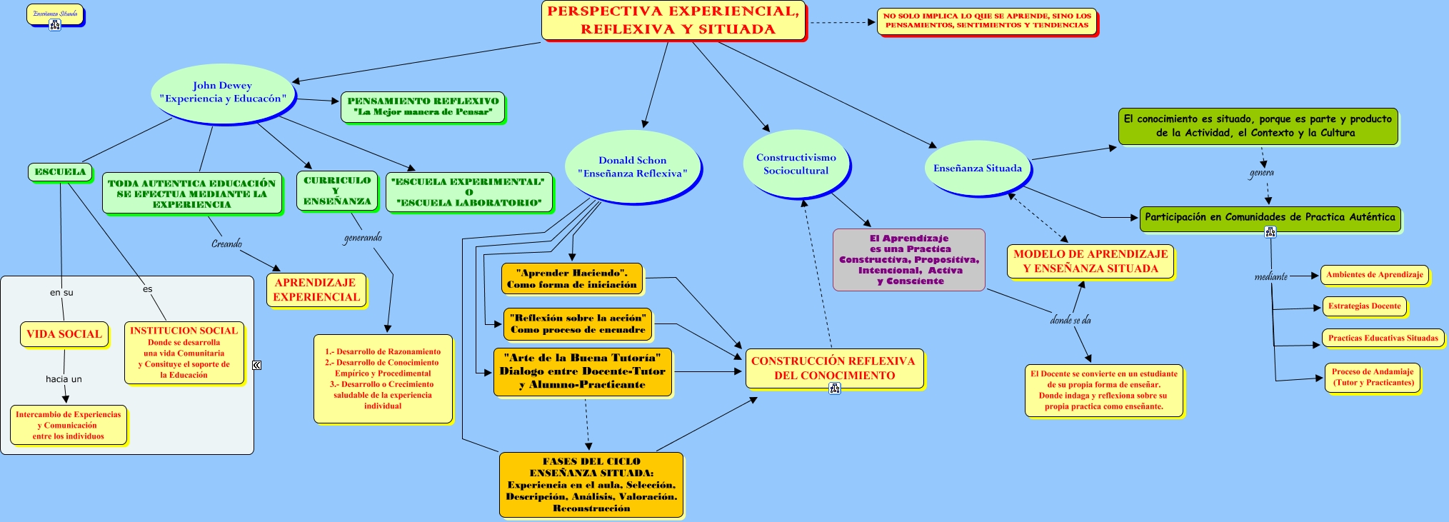 Este Cmap, tiene información relacionada con: 01 ENSEÑANZA SITUADA, PERSPECTIVA EXPERIENCIAL, REFLEXIVA Y SITUADA Constructivismo Sociocultural El Aprendizaje es una Practica Constructiva, Propositiva, Intencional, Activa y Consciente, PERSPECTIVA EXPERIENCIAL, REFLEXIVA Y SITUADA Donald Schon "Enseñanza Reflexiva" FASES DEL CICLO ENSEÑANZA SITUADA: Experiencia en el aula, Selección, Descripción, Análisis, Valoración. Reconstrucción, El Aprendizaje es una Practica Constructiva, Propositiva, Intencional, Activa y Consciente donde se da MODELO DE APRENDIZAJE Y ENSEÑANZA SITUADA, PERSPECTIVA EXPERIENCIAL, REFLEXIVA Y SITUADA Donald Schon "Enseñanza Reflexiva" "Arte de la Buena Tutoría" Dialogo entre Docente-Tutor y Alumno-Practicante, Participación en Comunidades de Practica Auténtica mediante Estrategias Docente, PERSPECTIVA EXPERIENCIAL, REFLEXIVA Y SITUADA John Dewey "Experiencia y Educacón" "ESCUELA EXPERIMENTAL" O "ESCUELA LABORATORIO", TODA AUTENTICA EDUCACIÓN SE EFECTUA MEDIANTE LA EXPERIENCIA Creando APRENDIZAJE EXPERIENCIAL, CURRICULO Y ENSEÑANZA generando 1.- Desarrollo de Razonamiento 2.- Desarrollo de Conocimiento Empírico y Procedimental 3.- Desarrollo o Crecimiento saludable de la experiencia individual, PERSPECTIVA EXPERIENCIAL, REFLEXIVA Y SITUADA Donald Schon "Enseñanza Reflexiva" "Aprender Haciendo". Como forma de iniciación, Participación en Comunidades de Practica Auténtica mediante Practicas Educativas Situadas, PERSPECTIVA EXPERIENCIAL, REFLEXIVA Y SITUADA NO SOLO IMPLICA LO QUE SE APRENDE, SINO LOS PENSAMIENTOS, SENTIMIENTOS Y TENDENCIAS, MODELO DE APRENDIZAJE Y ENSEÑANZA SITUADA Enseñanza Situada Participación en Comunidades de Practica Auténtica, "Arte de la Buena Tutoría" Dialogo entre Docente-Tutor y Alumno-Practicante CONSTRUCCIÓN REFLEXIVA DEL CONOCIMIENTO, PERSPECTIVA EXPERIENCIAL, REFLEXIVA Y SITUADA John Dewey "Experiencia y Educacón" TODA AUTENTICA EDUCACIÓN SE EFECTUA MEDIANTE LA EXPERIENCIA, VIDA SOCIAL hacia un Intercambio de Experiencias y Comunicación entre los individuos, El Aprendizaje es una Practica Constructiva, Propositiva, Intencional, Activa y Consciente donde se da El Docente se convierte en un estudiante de su propia forma de enseñar. Donde indaga y reflexiona sobre su propia practica como enseñante., Participación en Comunidades de Practica Auténtica mediante Ambientes de Aprendizaje, PERSPECTIVA EXPERIENCIAL, REFLEXIVA Y SITUADA John Dewey "Experiencia y Educacón" PENSAMIENTO REFLEXIVO "La Mejor manera de Pensar", "Aprender Haciendo". Como forma de iniciación CONSTRUCCIÓN REFLEXIVA DEL CONOCIMIENTO, PERSPECTIVA EXPERIENCIAL, REFLEXIVA Y SITUADA Donald Schon "Enseñanza Reflexiva" "Reflexión sobre la acción" Como proceso de encuadre