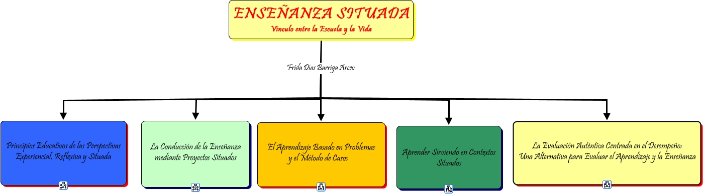 Este Cmap, tiene información relacionada con: ENSEÑANZA SITUADA, ENSEÑANZA SITUADA Vínculo entre la Escuela y la Vida Frida Días Barriga Arceo El Aprendizaje Basado en Problemas y el Método de Casos, ENSEÑANZA SITUADA Vínculo entre la Escuela y la Vida Frida Días Barriga Arceo Aprender Sirviendo en Contextos Situados, ENSEÑANZA SITUADA Vínculo entre la Escuela y la Vida Frida Días Barriga Arceo Principios Educativos de las Perspectivas Experiencial, Reflexiva y Situada, ENSEÑANZA SITUADA Vínculo entre la Escuela y la Vida Frida Días Barriga Arceo La Evaluación Auténtica Centrada en el Desempeño: Una Alternativa para Evaluar el Aprendizaje y la Enseñanza, ENSEÑANZA SITUADA Vínculo entre la Escuela y la Vida Frida Días Barriga Arceo La Conducción de la Enseñanza mediante Proyectos Situados