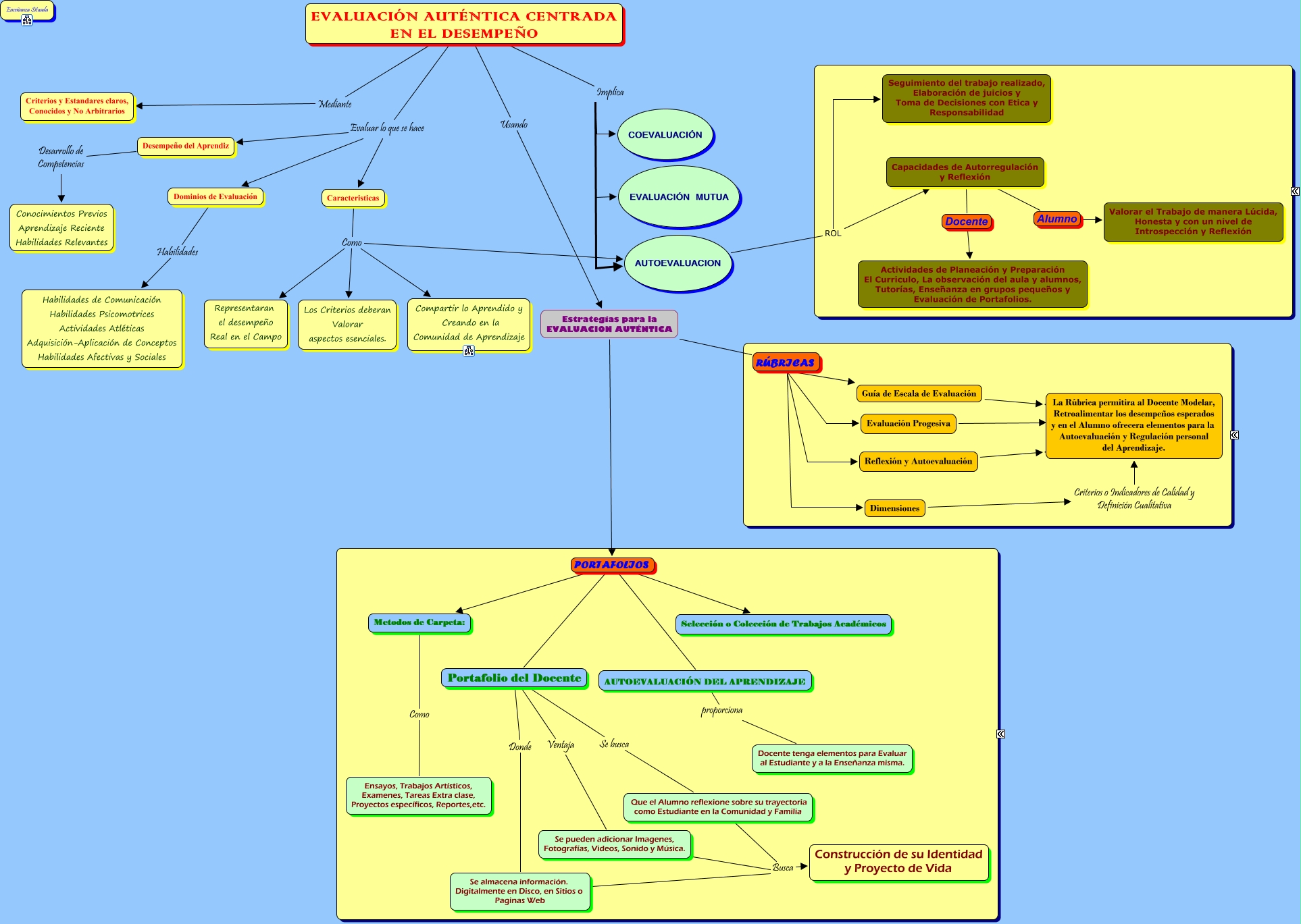 Este Cmap, tiene información relacionada con: 05 EVALUACION AUTENTICA CENTRADA EN EL DESEMPEÑO, Desempeño del Aprendiz Desarrollo de Competencias Conocimientos Previos Aprendizaje Reciente Habilidades Relevantes, EVALUACIÓN AUTÉNTICA CENTRADA EN EL DESEMPEÑO Evaluar lo que se hace Caracteristicas, Guía de Escala de Evaluación La Rúbrica permitira al Docente Modelar, Retroalimentar los desempeños esperados y en el Alumno ofrecera elementos para la Autoevaluación y Regulación personal del Aprendizaje., Caracteristicas Como Representaran el desempeño Real en el Campo, Dimensiones Criterios o Indicadores de Calidad y Definición Cualitativa La Rúbrica permitira al Docente Modelar, Retroalimentar los desempeños esperados y en el Alumno ofrecera elementos para la Autoevaluación y Regulación personal del Aprendizaje., EVALUACIÓN AUTÉNTICA CENTRADA EN EL DESEMPEÑO Evaluar lo que se hace Dominios de Evaluación, Estrategías para la EVALUACION AUTÉNTICA RÚBRICAS Reflexión y Autoevaluación, Se almacena información. Digitalmente en Disco, en Sitios o Paginas Web Busca Construcción de su Identidad y Proyecto de Vida, EVALUACIÓN AUTÉNTICA CENTRADA EN EL DESEMPEÑO Mediante Criterios y Estandares claros, Conocidos y No Arbitrarios, EVALUACIÓN AUTÉNTICA CENTRADA EN EL DESEMPEÑO Evaluar lo que se hace Desempeño del Aprendiz, Estrategías para la EVALUACION AUTÉNTICA RÚBRICAS Guía de Escala de Evaluación, Capacidades de Autorregulación y Reflexión Docente Actividades de Planeación y Preparación El Curriculo, La observación del aula y alumnos, Tutorías, Enseñanza en grupos pequeños y Evaluación de Portafolios., Estrategías para la EVALUACION AUTÉNTICA PORTAFOLIOS Selección o Colección de Trabajos Académicos, Estrategías para la EVALUACION AUTÉNTICA PORTAFOLIOS Portafolio del Docente, EVALUACIÓN AUTÉNTICA CENTRADA EN EL DESEMPEÑO Usando Estrategías para la EVALUACION AUTÉNTICA, Estrategías para la EVALUACION AUTÉNTICA PORTAFOLIOS AUTOEVALUACIÓN DEL APRENDIZAJE, Estrategías para la EVALUACION AUTÉNTICA PORTAFOLIOS Metodos de Carpeta:, Reflexión y Autoevaluación La Rúbrica permitira al Docente Modelar, Retroalimentar los desempeños esperados y en el Alumno ofrecera elementos para la Autoevaluación y Regulación personal del Aprendizaje., AUTOEVALUACION ROL Capacidades de Autorregulación y Reflexión, EVALUACIÓN AUTÉNTICA CENTRADA EN EL DESEMPEÑO Implica EVALUACIÓN MUTUA