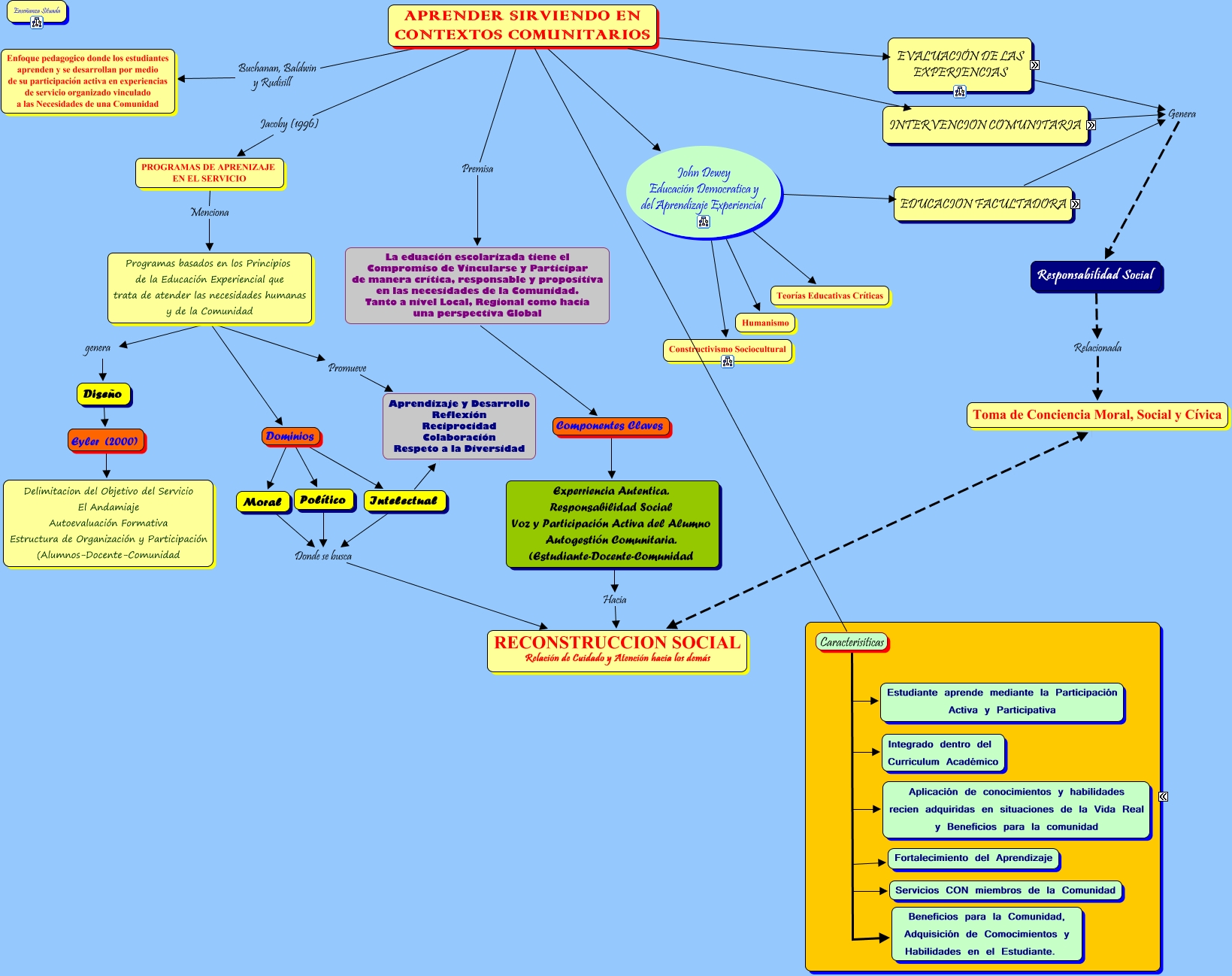 Este Cmap, tiene información relacionada con: 04 APRENDER SIRVIENDO EN CONTEXTOS COMUNITARIOS, Sistema de Autoevaluación Shumer (2000) DIMENSIONES, La eduación escolarizada tiene el Compromiso de Vincularse y Participar de manera crítica, responsable y propositiva en las necesidades de la Comunidad. Tanto a nivel Local, Regional como hacia una perspectiva Global Componentes Claves Experriencia Autentica. Responsabilidad Social Voz y Participación Activa del Alumno Autogestión Comunitaria. (Estudiante-Docente-Comunidad, Programas basados en los Principios de la Educación Experiencial que trata de atender las necesidades humanas y de la Comunidad Dominios Político, Experriencia Autentica. Responsabilidad Social Voz y Participación Activa del Alumno Autogestión Comunitaria. (Estudiante-Docente-Comunidad Hacia RECONSTRUCCION SOCIAL Relación de Cuidado y Atención hacia los demás, APRENDER SIRVIENDO EN CONTEXTOS COMUNITARIOS INTERVENCION COMUNITARIA COMUNIDAD, APRENDER SIRVIENDO EN CONTEXTOS COMUNITARIOS Caracterisiticas Integrado dentro del Curriculum Académico, APRENDER SIRVIENDO EN CONTEXTOS COMUNITARIOS Premisa La eduación escolarizada tiene el Compromiso de Vincularse y Participar de manera crítica, responsable y propositiva en las necesidades de la Comunidad. Tanto a nivel Local, Regional como hacia una perspectiva Global, Diseño Eyler (2000) Delimitacion del Objetivo del Servicio El Andamiaje Autoevaluación Formativa Estructura de Organización y Participación (Alumnos-Docente-Comunidad, APRENDER SIRVIENDO EN CONTEXTOS COMUNITARIOS Evaluación de las Experiencias de Aprendizaje en el Servicio Sistema de Autoevaluación, EDUCACIÓN FACULTADORA Claus y Ogden (1999) Aprendizaje Activo y Centrado en experiencias significativas y Motivadoras, Desarrollo o Construcción de la IDENTIDAD de la Persona Inciden Vinculasión Social, Intelectual Donde se busca RECONSTRUCCION SOCIAL Relación de Cuidado y Atención hacia los demás, Vinculasión Social ACTIVIDAD SIGNIFICATIVA Interacciones Sociales con personas diversas, Desarrollo o Construcción de la IDENTIDAD de la Persona Inciden Agencia o Autodeterminación, APRENDER SIRVIENDO EN CONTEXTOS COMUNITARIOS John Dewey Educación Democratica y del Aprendizaje Experiencial Humanismo, Agencia o Autodeterminación ACTIVIDAD SIGNIFICATIVA Necesidad Social Patente, Programas basados en los Principios de la Educación Experiencial que trata de atender las necesidades humanas y de la Comunidad genera Diseño, APRENDER SIRVIENDO EN CONTEXTOS COMUNITARIOS Evaluación de las Experiencias de Aprendizaje en el Servicio Aprendizaje Desarrollo Social y Personal Desarrollo de la Trayectoria Profesional Relaciones con las Instituciones, APRENDER SIRVIENDO EN CONTEXTOS COMUNITARIOS John Dewey Educación Democratica y del Aprendizaje Experiencial Constructivismo Sociocultural, MODELOS Como Modelo Participativo