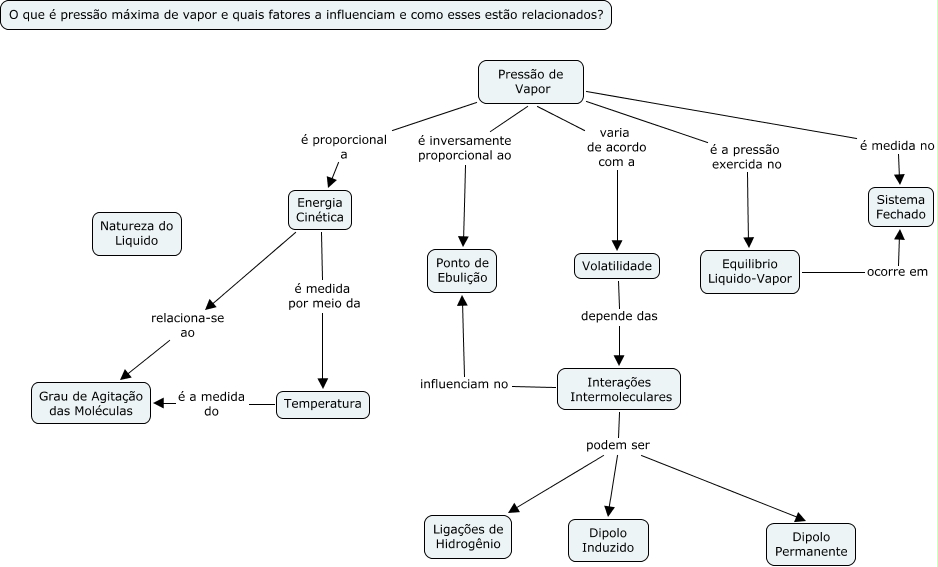 Esse mapa conceitual, produzido no IHMC CmapTools, tem a informação relacionada a: construindo PMV, Pressão de Vapor é medida no Sistema Fechado, Equilibrio Liquido-Vapor ocorre em Sistema Fechado, Interações Intermoleculares podem ser Ligações de Hidrogênio, Interações Intermoleculares podem ser Dipolo Permanente, Pressão de Vapor é proporcional a Energia Cinética, Pressão de Vapor é a pressão exercida no Equilibrio Liquido-Vapor, Pressão de Vapor é inversamente proporcional ao Ponto de Ebulição, Pressão de Vapor varia de acordo com a Volatilidade, Energia Cinética é medida por meio da Temperatura, Energia Cinética relaciona-se ao Grau de Agitação das Moléculas, Volatilidade depende das Interações Intermoleculares, Temperatura é a medida do Grau de Agitação das Moléculas, Interações Intermoleculares podem ser Dipolo Induzido