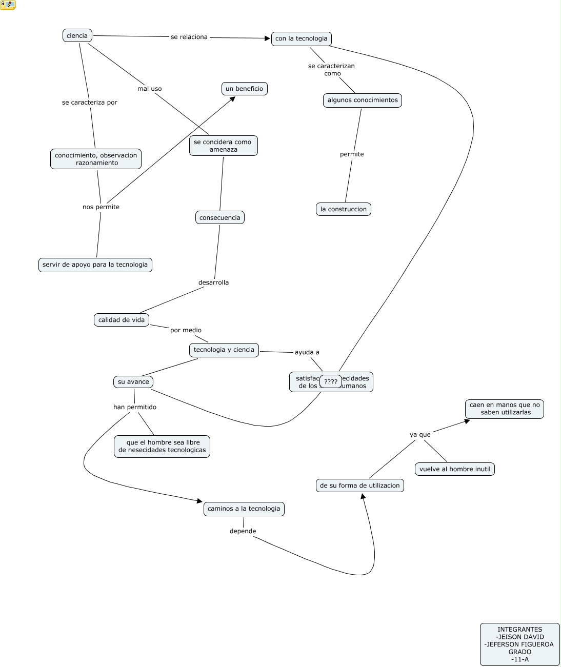 Este Cmap, tiene información relacionada con: JEFERSON , JEISON, su avance han permitido que el hombre sea libre de nesecidades tecnologicas, calidad de vida por medio tecnologia y ciencia, satisfacaer nesecidades de los seres humanos ???? con la tecnologia, tecnologia y ciencia ???? su avance, ciencia se relaciona con la tecnologia, con la tecnologia se caracterizan como algunos conocimientos, su avance ???? ????, tecnologia y ciencia ayuda a satisfacaer nesecidades de los seres humanos, algunos conocimientos permite la construccion, de su forma de utilizacion ya que caen en manos que no saben utilizarlas, conocimiento, observacion razonamiento nos permite un beneficio, ciencia se caracteriza por conocimiento, observacion razonamiento, su avance han permitido caminos a la tecnologia, conocimiento, observacion razonamiento nos permite servir de apoyo para la tecnologia, se concidera como amenaza ???? consecuencia, ciencia mal uso se concidera como amenaza, de su forma de utilizacion ya que vuelve al hombre inutil, caminos a la tecnologia depende de su forma de utilizacion, consecuencia desarrolla calidad de vida