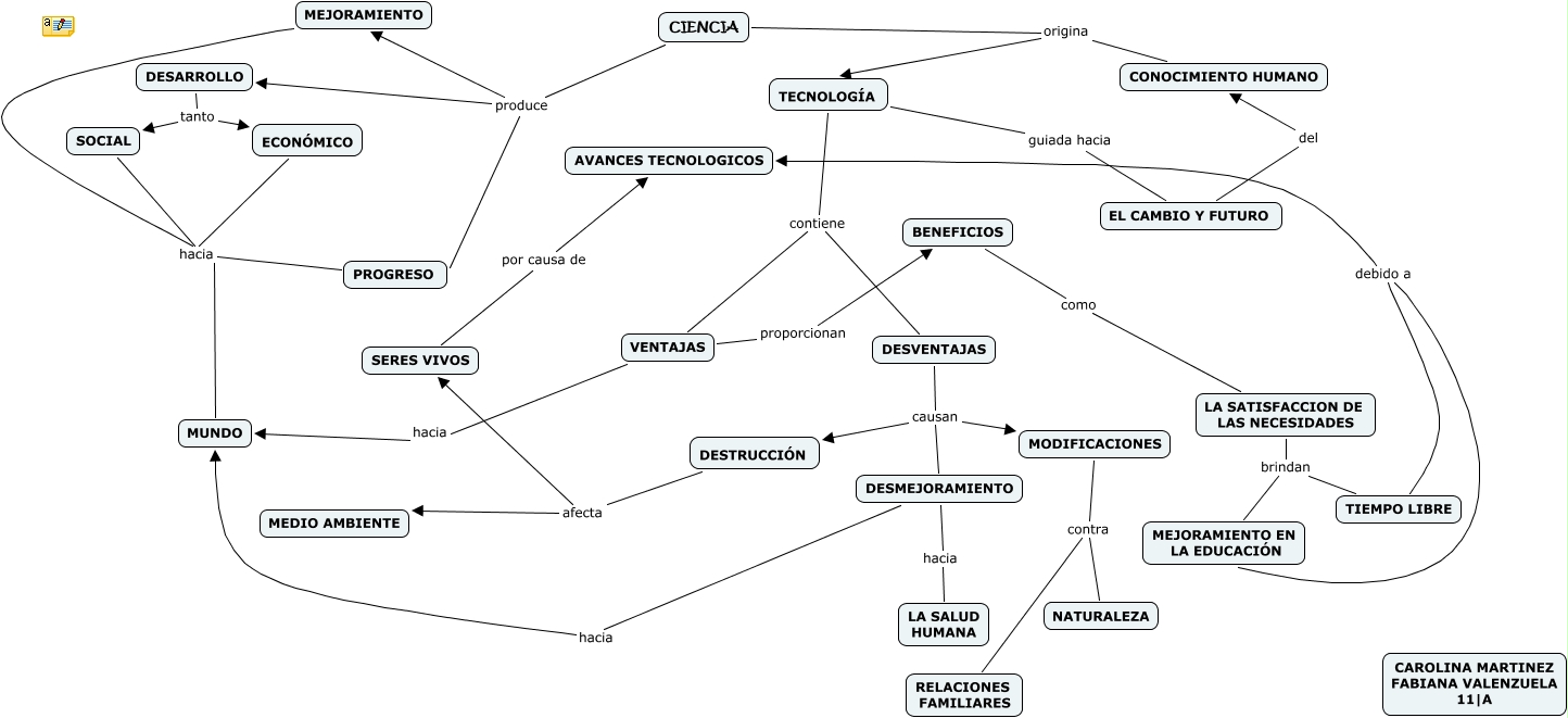 Este Cmap, tiene información relacionada con: CAROLINA MARTINEZ-FABIANA VALENZUELA, MODIFICACIONES contra NATURALEZA, CIENCIA produce DESARROLLO, CIENCIA produce MEJORAMIENTO, TECNOLOGÍA guiada hacia EL CAMBIO Y FUTURO, SERES VIVOS por causa de AVANCES TECNOLOGICOS, PROGRESO hacia MUNDO, TECNOLOGÍA contiene DESVENTAJAS, MODIFICACIONES contra RELACIONES FAMILIARES, DESTRUCCIÓN afecta SERES VIVOS, MEJORAMIENTO EN LA EDUCACIÓN debido a AVANCES TECNOLOGICOS, ECONÓMICO hacia MUNDO, CONOCIMIENTO HUMANO origina TECNOLOGÍA, DESMEJORAMIENTO hacia MUNDO, DESVENTAJAS causan DESTRUCCIÓN, MEJORAMIENTO hacia MUNDO, BENEFICIOS como LA SATISFACCION DE LAS NECESIDADES, CIENCIA produce PROGRESO, DESARROLLO tanto SOCIAL, DESMEJORAMIENTO hacia LA SALUD HUMANA, SOCIAL hacia MUNDO