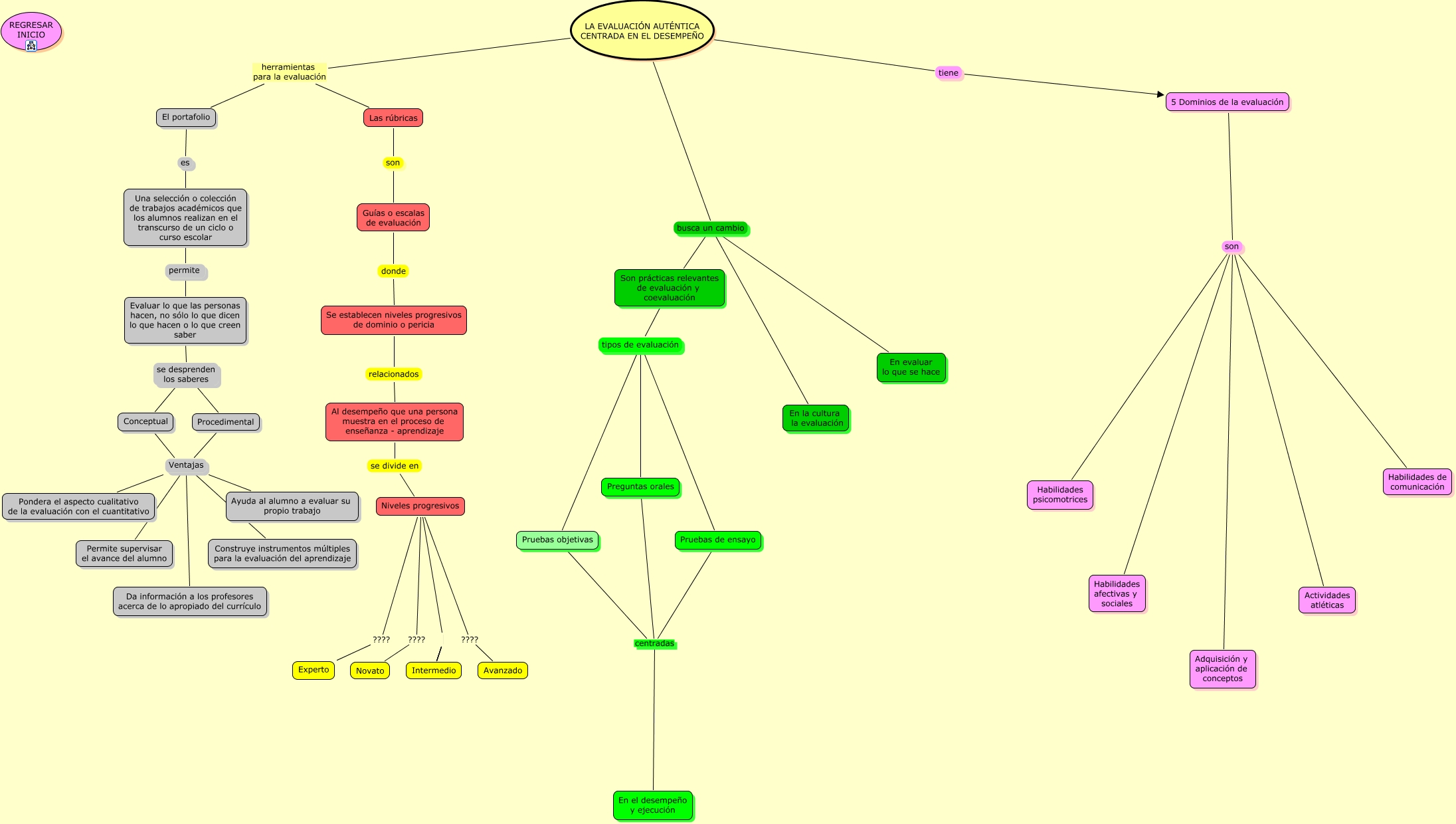 Este Cmap, tiene información relacionada con: CAP 5 ADRY, Al desempeño que una persona muestra en el proceso de enseñanza - aprendizaje se divide en Niveles progresivos, Niveles progresivos Intermedio, Conceptual Ventajas Da información a los profesores acerca de lo apropiado del currículo, LA EVALUACIÓN AUTÉNTICA CENTRADA EN EL DESEMPEÑO herramientas para la evaluación El portafolio, Niveles progresivos Intermedio, Conceptual Ventajas Ayuda al alumno a evaluar su propio trabajo, LA EVALUACIÓN AUTÉNTICA CENTRADA EN EL DESEMPEÑO busca un cambio En evaluar lo que se hace, Niveles progresivos ???? Avanzado, Preguntas orales centradas En el desempeño y ejecución, LA EVALUACIÓN AUTÉNTICA CENTRADA EN EL DESEMPEÑO busca un cambio Son prácticas relevantes de evaluación y coevaluación, Conceptual Ventajas Pondera el aspecto cualitativo de la evaluación con el cuantitativo, 5 Dominios de la evaluación son Habilidades psicomotrices, Son prácticas relevantes de evaluación y coevaluación tipos de evaluación Preguntas orales, El portafolio es Una selección o colección de trabajos académicos que los alumnos realizan en el transcurso de un ciclo o curso escolar, Procedimental Ventajas Permite supervisar el avance del alumno, LA EVALUACIÓN AUTÉNTICA CENTRADA EN EL DESEMPEÑO tiene 5 Dominios de la evaluación, Son prácticas relevantes de evaluación y coevaluación tipos de evaluación Pruebas objetivas, Son prácticas relevantes de evaluación y coevaluación tipos de evaluación Pruebas de ensayo, Conceptual Ventajas Construye instrumentos múltiples para la evaluación del aprendizaje, Evaluar lo que las personas hacen, no sólo lo que dicen lo que hacen o lo que creen saber se desprenden los saberes Procedimental