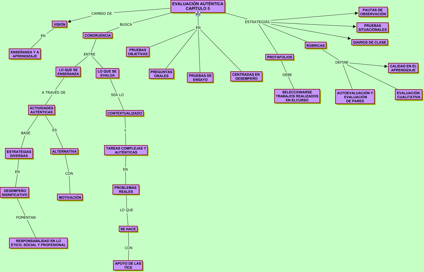 Este Cmap, tiene información relacionada con: EVALUACIÓN AUTÉNTICA, EVALUACIÓN AUTÉNTICA CAPÍTULO 5 ESTRATEGIÁS RÚBRICAS, EVALUACIÓN AUTÉNTICA CAPÍTULO 5 ESTRATEGIÁS DIARIOS DE CLASE, RÚBRICAS DEFINE CALIDAD EN EL APRENDIZAJE, LO QUE SE EVALÚA SEA LO CONTEXTUALIZADO, CONGRUENCIA ENTRE LO QUE SE ENSEÑANZA, VISIÓN EN ENSEÑANZA Y A APRENDIZAJE, DESEMPEÑO SIGNIFICATIVO FOMENTAN RESPONSABILIDAD EN LO ÉTICO, SOCIAL Y PROFESIONAL, ACTIVIDADES AUTÉNTICAS ES ALTERNATIVA, CONGRUENCIA ENTRE LO QUE SE EVALÚA, ALTERNATIVA CON MOTIVACIÓN, ESTRATÉGIAS DIVERSAS EN DESEMPEÑO SIGNIFICATIVO, TAREAS COMPLEJAS Y AUTÉNTICAS EN PROBLEMAS REALES, EVALUACIÓN AUTÉNTICA CAPÍTULO 5 EN PREGUNTAS ORALES, EVALUACIÓN AUTÉNTICA CAPÍTULO 5 ESTRATEGIÁS PRUEBAS SITUACIONALES, EVALUACIÓN AUTÉNTICA CAPÍTULO 5 ESTRATEGIÁS PAUTAS DE OBSERVACIÓN, PROTAFOLIOS DEBE SELECCIONARSE TRABAJOS REALIZADOS EN ELCURSO, RÚBRICAS DEFINE AUTOEVALUACIÓN Y EVALUACIÓN DE PARES, PROBLEMAS REALES LO QUE SE HACE, RÚBRICAS DEFINE EVALUACIÓN CUALITATIVA, EVALUACIÓN AUTÉNTICA CAPÍTULO 5 ESTRATEGIÁS PROTAFOLIOS