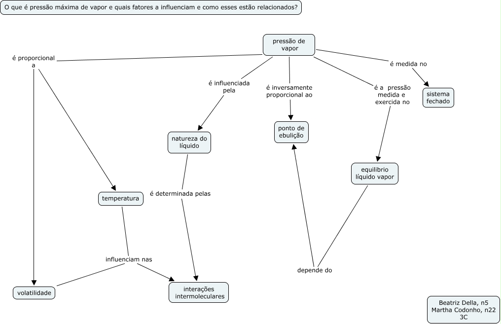 Esse mapa conceitual, produzido no IHMC CmapTools, tem a informação relacionada a: pmv martha e bia 3c, equilibrio líquido vapor depende do ponto de ebulição, natureza do líquido é determinada pelas interações intermoleculares, pressão de vapor é medida no sistema fechado, volatilidade influenciam nas interações intermoleculares, temperatura influenciam nas interações intermoleculares, pressão de vapor é influenciada pela natureza do líquido, pressão de vapor é inversamente proporcional ao ponto de ebulição, pressão de vapor é a pressão medida e exercida no equilibrio líquido vapor, pressão de vapor é proporcional a temperatura, pressão de vapor é proporcional a volatilidade