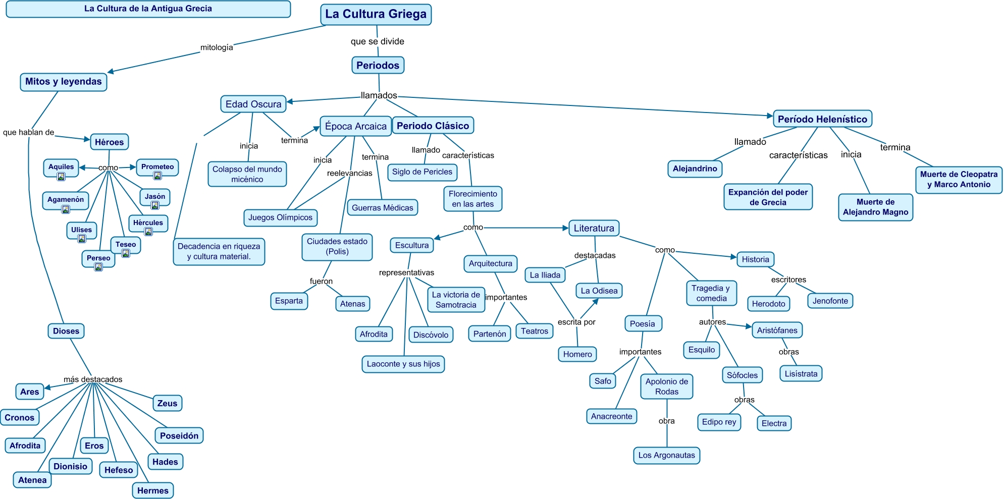 Este Cmap, tiene información relacionada con: La Cultura Griega-Lore Rgz-EvaluaFinal, Florecimiento en las artes como Literatura, Héroes como Aquiles, Dioses más destacados Cronos, Época Arcaica reelevancias Ciudades estado (Polis), Arquitectura importantes Teatros, Período Helenístico llamado Alejandrino, Edad Oscura termina Época Arcaica, Período Helenístico termina Muerte de Cleopatra y Marco Antonio, Periodo Clásico características Florecimiento en las artes, Escultura representativas La victoria de Samotracia, Dioses más destacados Dionisio, La Cultura Griega mitología Mitos y leyendas, Héroes como Ulises, Dioses más destacados Ares, Apolonio de Rodas obra Los Argonautas, Ciudades estado (Polis) fueron Esparta, Literatura como Historia, Arquitectura importantes Partenón, Dioses más destacados Hermes, Escultura representativas Discóvolo