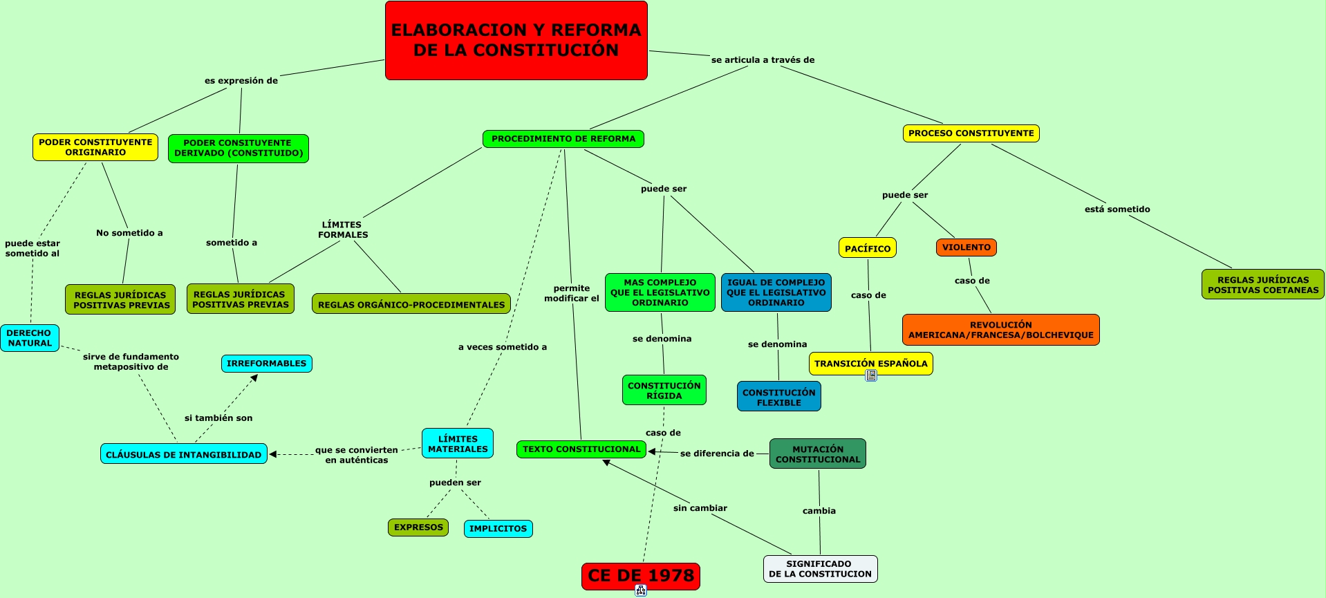 Este Cmap, tiene información relacionada con: tarea-nopresencial2-BAC, PODER CONSITUYENTE DERIVADO (CONSTITUIDO) sometido a REGLAS JURÍDICAS POSITIVAS PREVIAS, VIOLENTO caso de REVOLUCIÓN AMERICANA/FRANCESA/BOLCHEVIQUE, CLÁUSULAS DE INTANGIBILIDAD si también son IRREFORMABLES, PROCEDIMIENTO DE REFORMA puede ser IGUAL DE COMPLEJO QUE EL LEGISLATIVO ORDINARIO, LÍMITES MATERIALES pueden ser IMPLICITOS, ELABORACION Y REFORMA DE LA CONSTITUCIÓN se articula a través de PROCESO CONSTITUYENTE, PODER CONSITUYENTE DERIVADO (CONSTITUIDO) es expresión de PODER CONSTITUYENTE ORIGINARIO, PODER CONSTITUYENTE ORIGINARIO puede estar sometido al DERECHO NATURAL, CONSTITUCIÓN RÍGIDA caso de CE DE 1978, PACÍFICO caso de TRANSICIÓN ESPAÑOLA, IGUAL DE COMPLEJO QUE EL LEGISLATIVO ORDINARIO se denomina CONSTITUCIÓN FLEXIBLE, REGLAS JURÍDICAS POSITIVAS PREVIAS LÍMITES FORMALES REGLAS ORGÁNICO-PROCEDIMENTALES, PROCEDIMIENTO DE REFORMA se articula a través de PROCESO CONSTITUYENTE, PROCEDIMIENTO DE REFORMA LÍMITES FORMALES REGLAS ORGÁNICO-PROCEDIMENTALES, PROCEDIMIENTO DE REFORMA permite modificar el TEXTO CONSTITUCIONAL, PODER CONSTITUYENTE ORIGINARIO No sometido a REGLAS JURÍDICAS POSITIVAS PREVIAS, MUTACIÓN CONSTITUCIONAL cambia SIGNIFICADO DE LA CONSTITUCION, MAS COMPLEJO QUE EL LEGISLATIVO ORDINARIO se denomina CONSTITUCIÓN RÍGIDA, VIOLENTO puede ser PACÍFICO, PROCESO CONSTITUYENTE está sometido REGLAS JURÍDICAS POSITIVAS COETANEAS