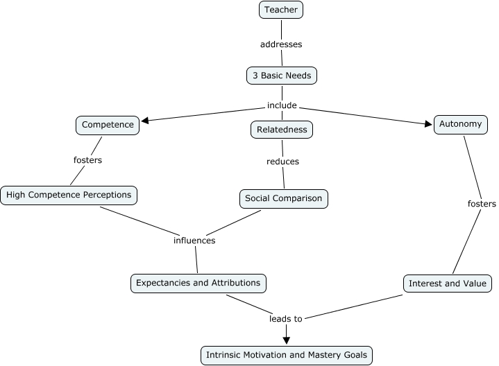 This Concept Map, created with IHMC CmapTools, has information related to: Motivation in the Classroom - Group B, Social Comparison influences Expectancies and Attributions, Interest and Value leads to Intrinsic Motivation and Mastery Goals, Teacher addresses 3 Basic Needs, 3 Basic Needs include Autonomy, 3 Basic Needs include Relatedness, Expectancies and Attributions leads to Intrinsic Motivation and Mastery Goals, High Competence Perceptions influences Expectancies and Attributions, Autonomy fosters Interest and Value, Relatedness reduces Social Comparison, Competence fosters High Competence Perceptions, 3 Basic Needs include Competence