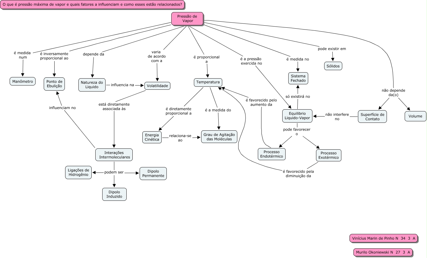 Esse mapa conceitual, produzido no IHMC CmapTools, tem a informação relacionada a: Mucão e Vih 3A, Temperatura é diretamente proporcional a Energia Cinética, Pressão de Vapor não depende da(o) Superfície de Contato, Volatilidade está diretamente associada às Interações Intermoleculares, Natureza do Liquido influencia na Volatilidade, Superfície de Contato não interfere no Equilibrio Liquido-Vapor, Pressão de Vapor não depende da(o) Volume, Equilibrio Liquido-Vapor só existirá no Sistema Fechado, Pressão de Vapor é a pressão exercida no Equilibrio Liquido-Vapor, Interações Intermoleculares podem ser Ligações de Hidrogênio, Pressão de Vapor é inversamente proporcional ao Ponto de Ebulição, Energia Cinética relaciona-se ao Grau de Agitação das Moléculas, Equilibrio Liquido-Vapor pode favorecer o Processo Endotérmico, Temperatura é a medida do Grau de Agitação das Moléculas, Pressão de Vapor é proporcional a Temperatura, Processo Endotérmico é favorecido pelo aumento da Temperatura, Interações Intermoleculares podem ser Dipolo Induzido, Pressão de Vapor é medida no Sistema Fechado, Pressão de Vapor varia de acordo com a Volatilidade, Pressão de Vapor é medida num Manômetro, Interações Intermoleculares podem ser Dipolo Permanente