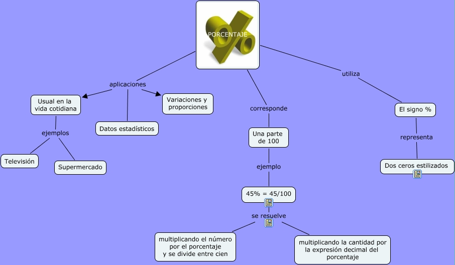 Este Cmap, tiene información relacionada con: Porcentaje, El signo % representa Dos ceros estilizados, PORCENTAJE aplicaciones Usual en la vida cotidiana, Usual en la vida cotidiana ejemplos Televisión, 45% = 45/100 se resuelve multiplicando la cantidad por la expresión decimal del porcentaje, PORCENTAJE corresponde Una parte de 100, Una parte de 100 ejemplo 45% = 45/100, Usual en la vida cotidiana ejemplos Supermercado, 45% = 45/100 se resuelve multiplicando el número por el porcentaje y se divide entre cien, PORCENTAJE aplicaciones Datos estadísticos, PORCENTAJE aplicaciones Variaciones y proporciones, PORCENTAJE utiliza El signo %