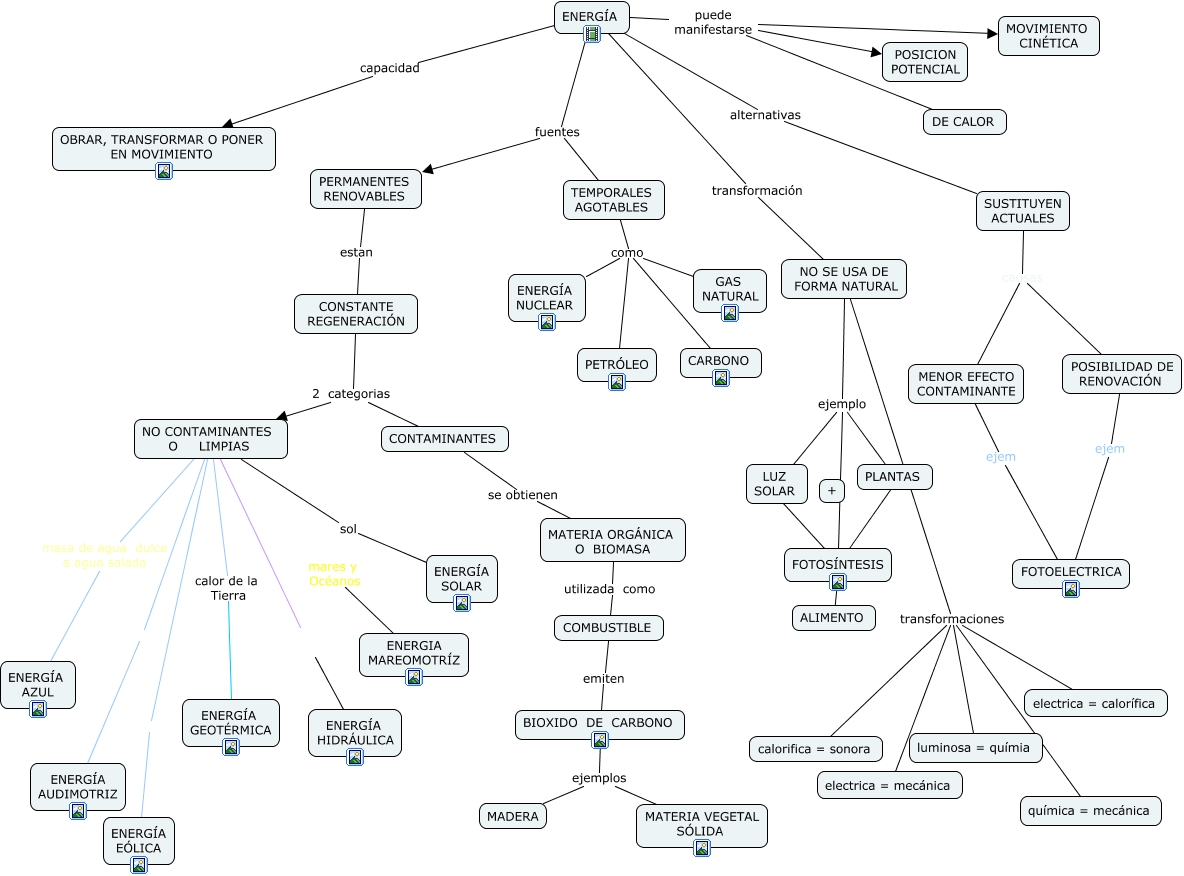 Este Cmap, tiene información relacionada con: energia_LUZ.Final, NO SE USA DE FORMA NATURAL transformaciones electrica = calorífica, ENERGÍA alternativas SUSTITUYEN ACTUALES, NO CONTAMINANTES O LIMPIAS masa de agua dulce a agua salada ENERGÍA AZUL, TEMPORALES AGOTABLES como CARBONO, TEMPORALES AGOTABLES como ENERGÍA NUCLEAR, LUZ SOLAR ???? FOTOSÍNTESIS, CONTAMINANTES se obtienen MATERIA ORGÁNICA O BIOMASA, TEMPORALES AGOTABLES como GAS NATURAL, NO SE USA DE FORMA NATURAL ejemplo FOTOSÍNTESIS, POSIBILIDAD DE RENOVACIÓN ejem FOTOELECTRICA, COMBUSTIBLE emiten BIOXIDO DE CARBONO, CONSTANTE REGENERACIÓN 2 categorias NO CONTAMINANTES O LIMPIAS, NO CONTAMINANTES O LIMPIAS viento ENERGÍA EÓLICA, NO SE USA DE FORMA NATURAL transformaciones luminosa = químia, NO CONTAMINANTES O LIMPIAS sol ENERGÍA SOLAR, NO SE USA DE FORMA NATURAL ejemplo LUZ SOLAR, ENERGÍA fuentes PERMANENTES RENOVABLES, ENERGÍA puede manifestarse MOVIMIENTO CINÉTICA, PLANTAS ???? FOTOSÍNTESIS, FOTOSÍNTESIS ???? ALIMENTO