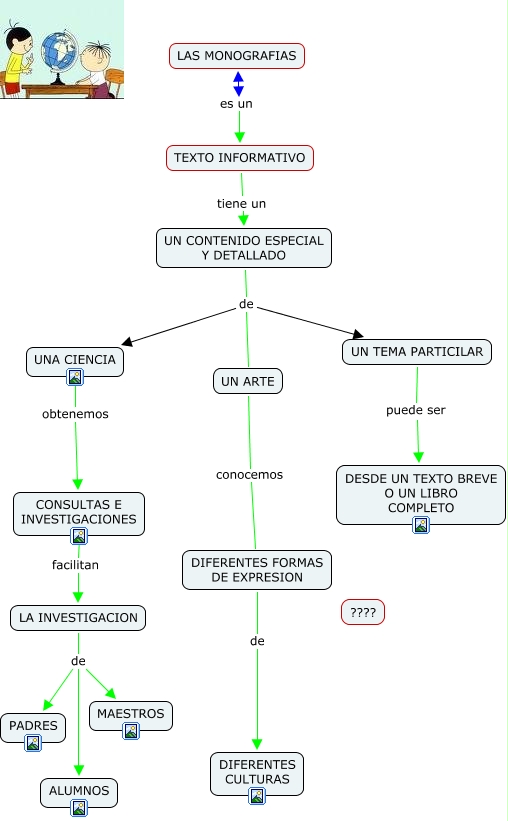 Este Cmap, tiene información relacionada con: LAS MONOGRAFIAS_Claudia, UN CONTENIDO ESPECIAL Y DETALLADO de UN ARTE, UNA CIENCIA obtenemos CONSULTAS E INVESTIGACIONES, LAS MONOGRAFIAS es un TEXTO INFORMATIVO, CONSULTAS E INVESTIGACIONES facilitan LA INVESTIGACION, LA INVESTIGACION de MAESTROS, UN CONTENIDO ESPECIAL Y DETALLADO de UN TEMA PARTICILAR, UN ARTE conocemos DIFERENTES FORMAS DE EXPRESION, DIFERENTES FORMAS DE EXPRESION de DIFERENTES CULTURAS, LA INVESTIGACION de ALUMNOS, UN CONTENIDO ESPECIAL Y DETALLADO de UNA CIENCIA, LA INVESTIGACION de PADRES, UN TEMA PARTICILAR puede ser DESDE UN TEXTO BREVE O UN LIBRO COMPLETO, TEXTO INFORMATIVO tiene un UN CONTENIDO ESPECIAL Y DETALLADO