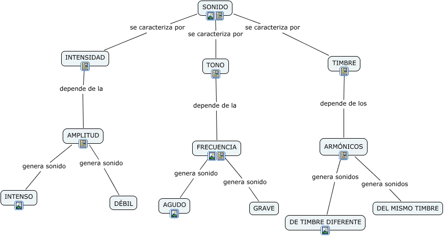 Este Cmap, tiene información relacionada con: SONIDO ANA, AMPLITUD genera sonido INTENSO, TIMBRE depende de los ARMÓNICOS, ARMÓNICOS genera sonidos DEL MISMO TIMBRE, AMPLITUD genera sonido DÉBIL, TONO depende de la FRECUENCIA, SONIDO se caracteriza por TIMBRE, SONIDO se caracteriza por TONO, FRECUENCIA genera sonido GRAVE, ARMÓNICOS genera sonidos DE TIMBRE DIFERENTE, FRECUENCIA genera sonido AGUDO, SONIDO se caracteriza por INTENSIDAD, INTENSIDAD depende de la AMPLITUD