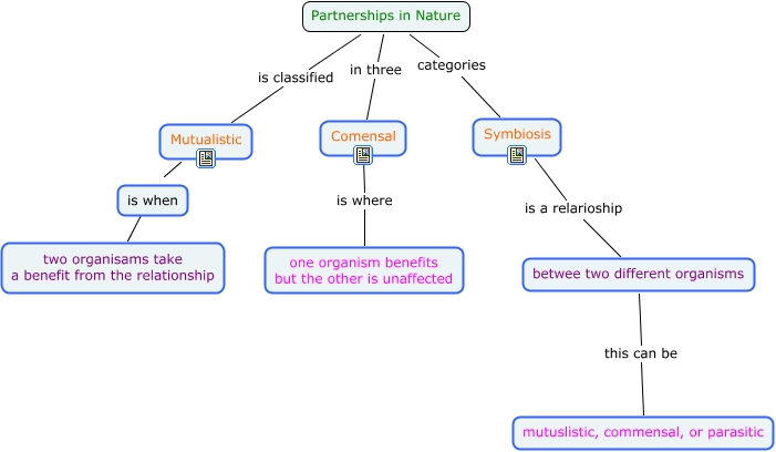 Este Cmap, tiene información relacionada con: Partnership, Symbiosis is a relarioship betwee two different organisms, Mutualistic two organisams take a benefit from the relationship, Comensal is where one organism benefits but the other is unaffected, Partnerships in Nature categories Symbiosis, Partnerships in Nature is classified Mutualistic, betwee two different organisms this can be mutuslistic, commensal, or parasitic, Partnerships in Nature in three Comensal