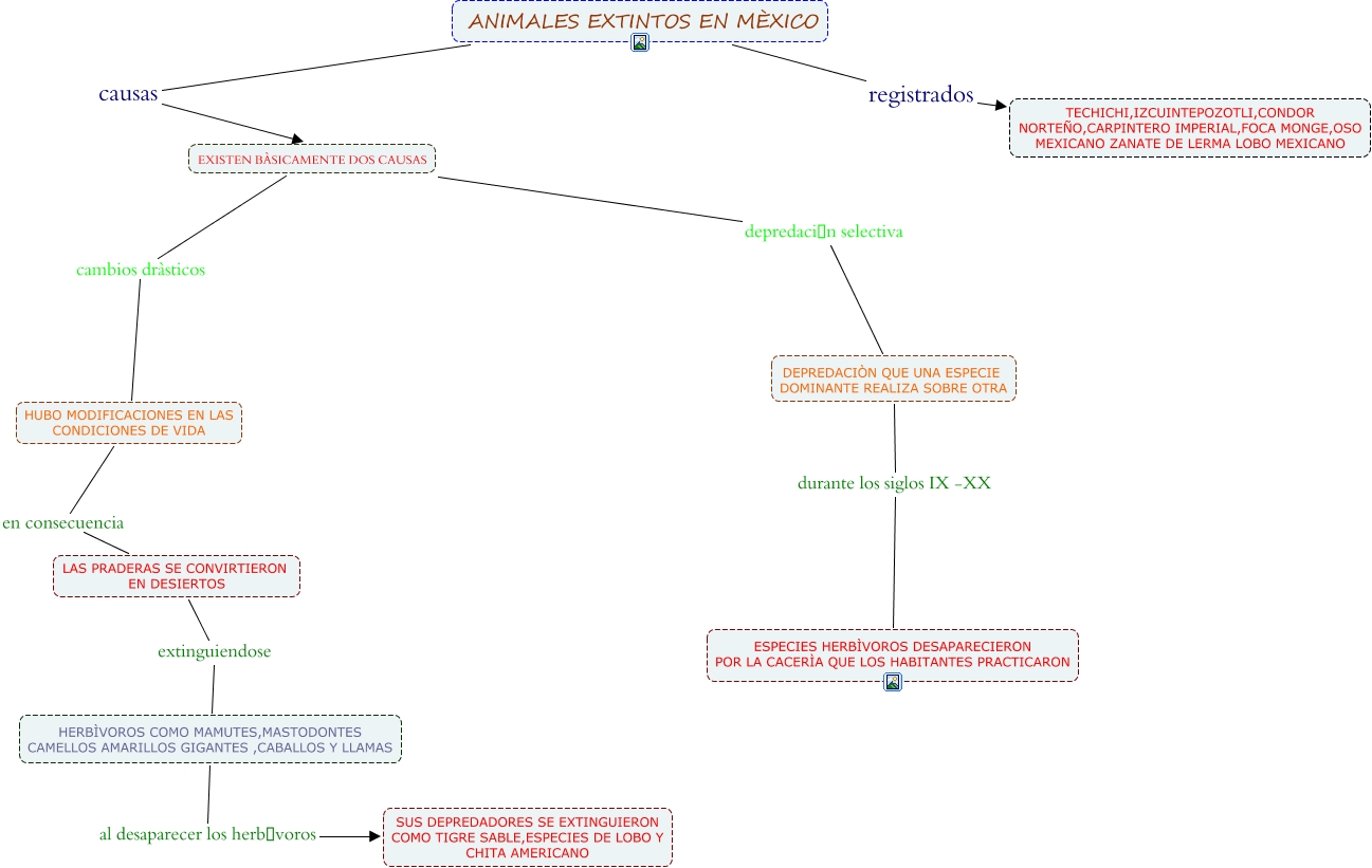 Este Cmap, tiene información relacionada con: ANIMALES EXTINTOS EN MEXICO PATY RAMIREZ, HUBO MODIFICACIONES EN LAS CONDICIONES DE VIDA en consecuencia LAS PRADERAS SE CONVIRTIERON EN DESIERTOS, EXISTEN BÀSICAMENTE DOS CAUSAS depredaciòn selectiva DEPREDACIÒN QUE UNA ESPECIE DOMINANTE REALIZA SOBRE OTRA, LAS PRADERAS SE CONVIRTIERON EN DESIERTOS extinguiendose HERBÌVOROS COMO MAMUTES,MASTODONTES CAMELLOS AMARILLOS GIGANTES ,CABALLOS Y LLAMAS, EXISTEN BÀSICAMENTE DOS CAUSAS cambios dràsticos HUBO MODIFICACIONES EN LAS CONDICIONES DE VIDA, ANIMALES EXTINTOS EN MÈXICO causas EXISTEN BÀSICAMENTE DOS CAUSAS, HERBÌVOROS COMO MAMUTES,MASTODONTES CAMELLOS AMARILLOS GIGANTES ,CABALLOS Y LLAMAS al desaparecer los herbìvoros SUS DEPREDADORES SE EXTINGUIERON COMO TIGRE SABLE,ESPECIES DE LOBO Y CHITA AMERICANO, DEPREDACIÒN QUE UNA ESPECIE DOMINANTE REALIZA SOBRE OTRA durante los siglos IX -XX ESPECIES HERBÌVOROS DESAPARECIERON POR LA CACERÌA QUE LOS HABITANTES PRACTICARON, ANIMALES EXTINTOS EN MÈXICO registrados TECHICHI,IZCUINTEPOZOTLI,CONDOR NORTEÑO,CARPINTERO IMPERIAL,FOCA MONGE,OSO MEXICANO ZANATE DE LERMA LOBO MEXICANO