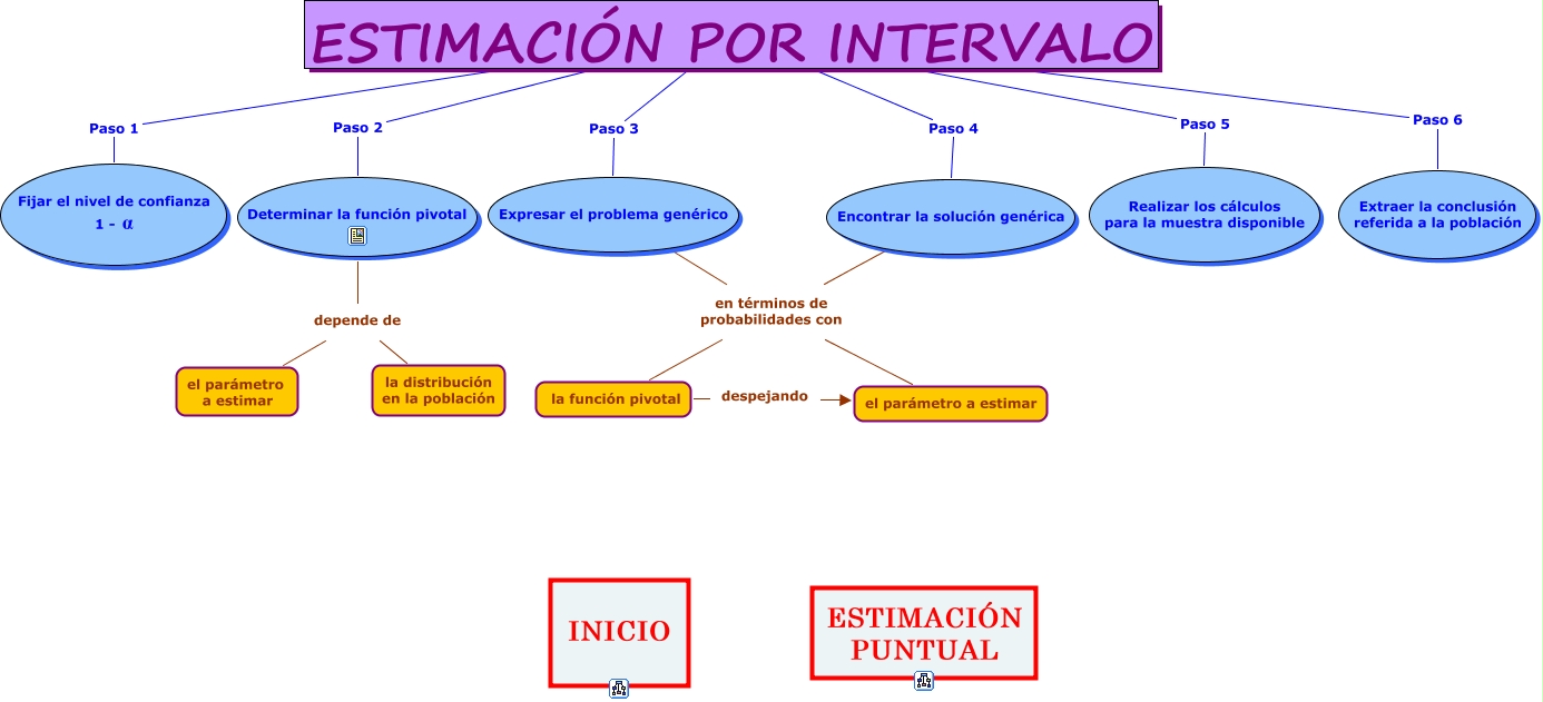 Este Cmap, tiene información relacionada con: Estimacion_intervalo, ESTIMACIÓN POR INTERVALO Paso 5 Realizar los cálculos para la muestra disponible, ESTIMACIÓN POR INTERVALO Paso 1 Fijar el nivel de confianza 1 - α, Determinar la función pivotal depende de el parámetro a estimar, ESTIMACIÓN POR INTERVALO Paso 6 Extraer la conclusión referida a la población, ESTIMACIÓN POR INTERVALO Paso 2 Determinar la función pivotal, Determinar la función pivotal depende de la distribución en la población, Expresar el problema genérico en términos de probabilidades con la función pivotal, Expresar el problema genérico en términos de probabilidades con Encontrar la solución genérica, Expresar el problema genérico en términos de probabilidades con el parámetro a estimar, ESTIMACIÓN POR INTERVALO Paso 3 Expresar el problema genérico, ESTIMACIÓN POR INTERVALO Paso 4 Encontrar la solución genérica, la función pivotal despejando el parámetro a estimar