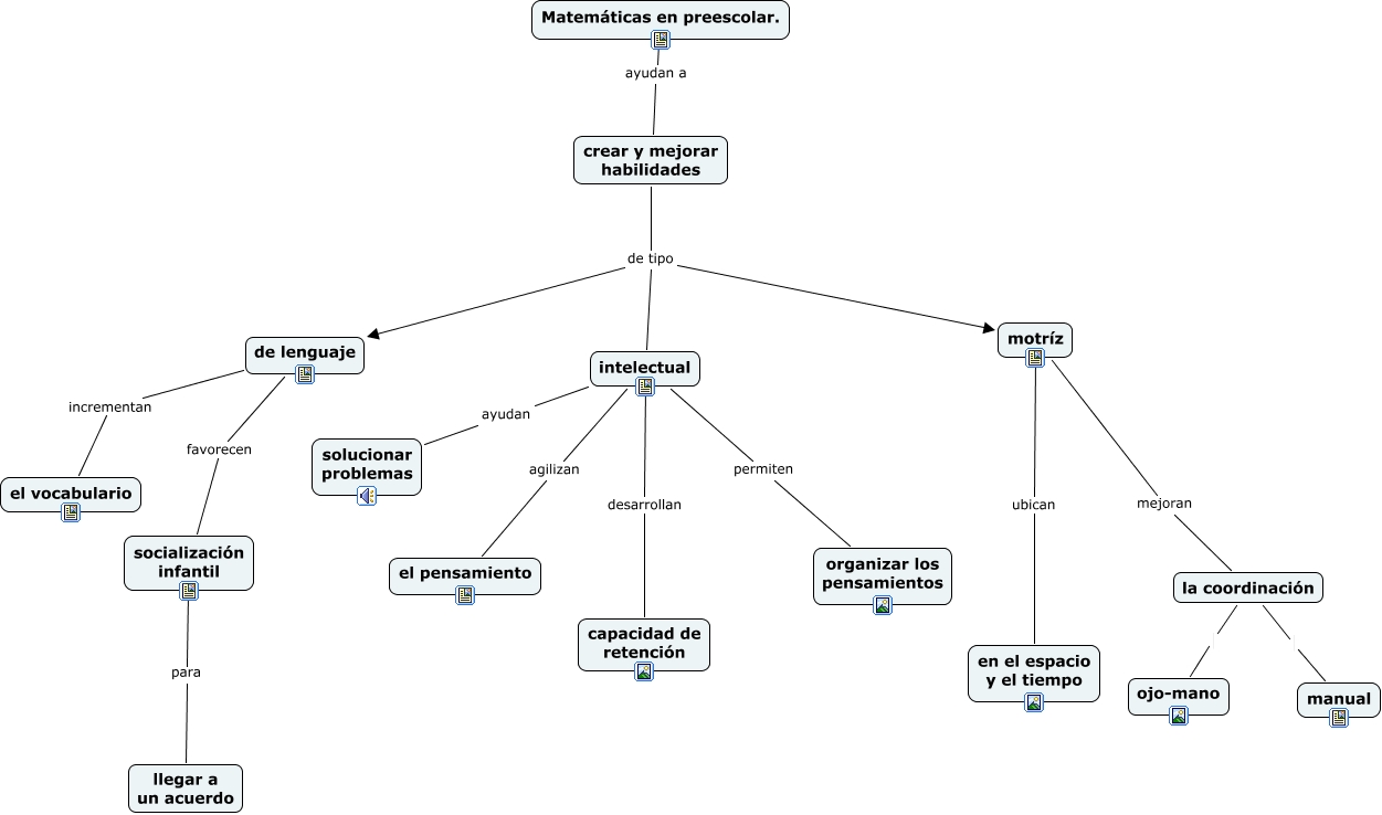 Este Cmap, tiene información relacionada con: matemáticas preescolar.cmap, Matemáticas en preescolar. ayudan a crear y mejorar habilidades, la coordinación ojo-mano, socialización infantil para llegar a un acuerdo, intelectual permiten organizar los pensamientos, intelectual desarrollan capacidad de retención, la coordinación manual, crear y mejorar habilidades de tipo intelectual, intelectual agilizan el pensamiento, de lenguaje incrementan el vocabulario, motríz mejoran la coordinación, motríz ubican en el espacio y el tiempo, crear y mejorar habilidades de tipo de lenguaje, de lenguaje favorecen socialización infantil, crear y mejorar habilidades de tipo motríz, intelectual ayudan solucionar problemas