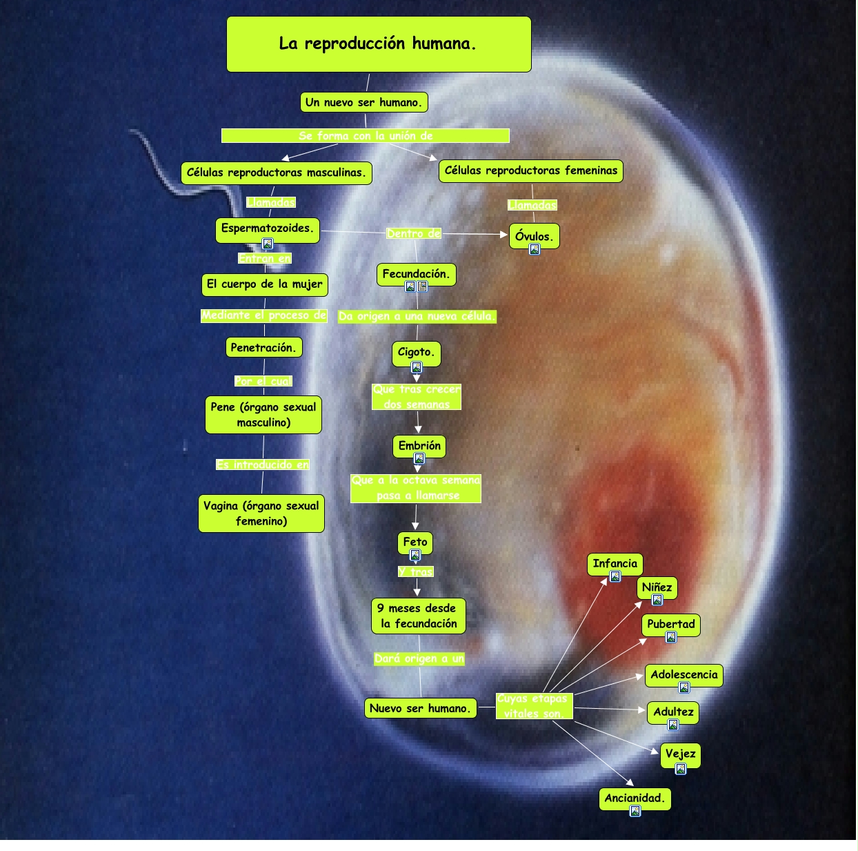 Este Cmap, tiene información relacionada con: LA repro, Nuevo ser humano. Cuyas etapas vitales son. Pubertad, Espermatozoides. Dentro de Fecundación., Un nuevo ser humano. Se forma con la unión de Células reproductoras femeninas, La reproducción humana. ???? Un nuevo ser humano., Espermatozoides. Dentro de Óvulos., 9 meses desde la fecundación Dará origen a un Nuevo ser humano., Un nuevo ser humano. Se forma con la unión de Células reproductoras masculinas., Células reproductoras femeninas Llamadas Óvulos., Pene (órgano sexual masculino) Es introducido en Vagina (órgano sexual femenino), Penetración. Por el cual Pene (órgano sexual masculino), Embrión Que a la octava semana pasa a llamarse Feto, Espermatozoides. Entran en El cuerpo de la mujer, Nuevo ser humano. Cuyas etapas vitales son. Adolescencia, Cigoto. Que tras crecer dos semanas Embrión, Nuevo ser humano. Cuyas etapas vitales son. Niñez, Nuevo ser humano. Cuyas etapas vitales son. Infancia, Un nuevo ser humano. Se forma con la unión de Células reproductoras masculinas., Feto Y tras 9 meses desde la fecundación, Fecundación. Da origen a una nueva célula. Cigoto., Células reproductoras masculinas. Llamadas Espermatozoides.