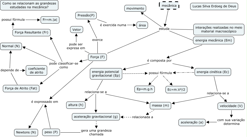 Esse mapa conceitual, produzido no IHMC CmapTools, tem a informação relacionada a: Mapa de Física (Trabalho Trimestral), Força (F) pode classificar-se como Força Resultante (Fr), peso (P) é expressado em Newtons (N), Força (F) pode classificar-se como Normal (N), Pressão(P) é exercida numa área, Força (F) é expressado em Newtons (N), Força de Atrito (Fat) depende de Normal (N), mecânica estuda interações realizadas no meio material macroscópico, energia potencial gravitacional (Ep) relaciona-se a aceleração gravitacional (g), Força (F) pode ser expresa em Vetor, energia potencial gravitacional (Ep) possui fórmula Ep=m.g.h, energia cinética (Ec) relaciona-se a velocidade (V), aceleração gravitacional (g) gera uma grandeza chamada peso (P), energia cinética (Ec) relaciona-se a massa (m), energia potencial gravitacional (Ep) possui fórmula Ec=m.V²/2, massa (m) relacionada a aceleração gravitacional (g), energia potencial gravitacional (Ep) relaciona-se a massa (m), mecânica estuda Força (F), energia cinética (Ec) possui fórmula Ec=m.V²/2, Força (F) exerce Pressão(P), Força (F) pode classificar-se como Força de Atrito (Fat)