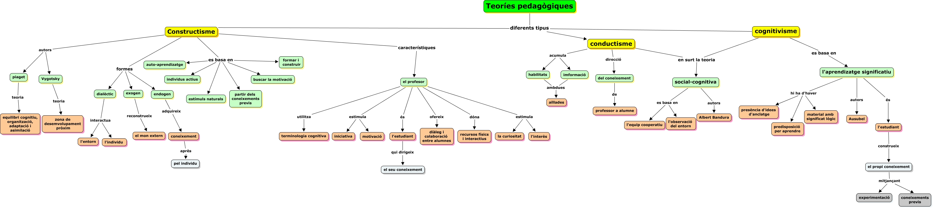 Este Cmap, tiene información relacionada con: TeoriesPedagogiques, dialèctic interactua l'individu, Constructisme es basa en auto-aprendizatge, social-cognitiva es basa en l'equip cooperatiu, Teoríes pedagògiques diferents tipus conductisme, Constructisme es basa en individus actius, el propi coneixement mitjançant experimentació, el profesor dóna recursos físics i interactius, el profesor estimula la curiositat, Constructisme es basa en estímuls naturals, el profesor és l'estudiant, el profesor estimula l'interès, exogen reconstrueix el mon extern, l'estudiant qui dirigeix el seu coneixement, Constructisme es basa en formar i construir, cognitivisme es basa en l'aprendizatge significatiu, l'estudiant construeix el propi coneixement, social-cognitiva es basa en l'observació del entorn, Constructisme formes dialèctic, Constructisme es basa en buscar la motivació, conductisme direcció del coneixement