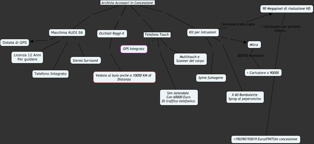Questa Cmap, creata con IHMC CmapTools, contiene informazioni relative a: Archivio Oggetti In Concessione, Kit per intrusioni Telecamera Microspia 90 Megapixel di risoluzione HD, Telefono Touch Multitouch e Scanner del corpo, Mitra 382938 Munizioni + Caricatore x 90000, Archivio Accessori in Concessione Occhiali Raggi-X, Archivio Accessori in Concessione Occhiali Raggi-X, Macchina AUDI S6 Telefono Integrato, Occhiali Raggi-X Vedono al buio anche a 10000 KM di Distanza, Kit per intrusioni Mitra, Archivio Accessori in Concessione Kit per intrusioni, Archivio Accessori in Concessione Telefono Touch, Kit per intrusioni Spine fumogene, Telefono Touch GPS Integrato, Telefono Touch Sim Aziendale Con 60000 Euro Di traffico telefonico, Macchina AUDI S6 Dotata di GPS, Macchina AUDI S6 Stereo Surround, Kit per intrusioni X 60 Bombolette Spray al peperoncino, 90 Megapixel di risoluzione HD + Ultrasuono per persona Umana.. +190390193019 Euro(FINTI)In concessione, Archivio Accessori in Concessione Macchina AUDI S6, Macchina AUDI S6 Licenza 12 Anni Per guidare