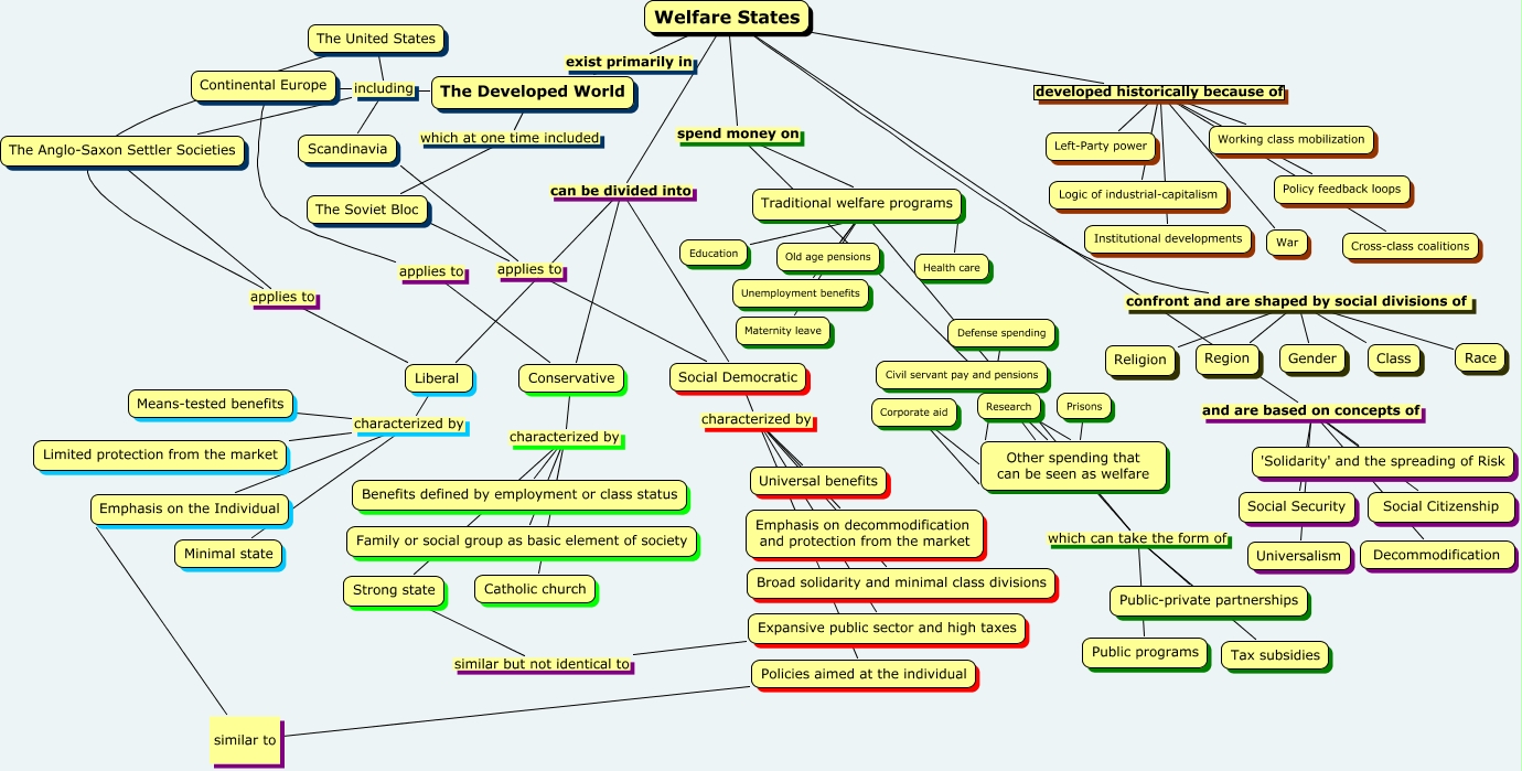 This Concept Map, created with IHMC CmapTools, has information related to: Welfare State Overview, Conservative characterized by Family or social group as basic element of society, Corporate aid Other spending that can be seen as welfare, Welfare States exist primarily in The Developed World, Social Democratic characterized by Expansive public sector and high taxes, Welfare States can be divided into Liberal, Corporate aid Other spending that can be seen as welfare, Health care Traditional welfare programs, Social Democratic characterized by Broad solidarity and minimal class divisions, Unemployment benefits Traditional welfare programs, Prisons Other spending that can be seen as welfare, Welfare States and are based on concepts of Social Citizenship, Liberal characterized by Means-tested benefits, Conservative characterized by Catholic church, Liberal characterized by Limited protection from the market, The Developed World which at one time included The Soviet Bloc, Education Traditional welfare programs, Civil servant pay and pensions Other spending that can be seen as welfare, Welfare States and are based on concepts of Social Security, Welfare States developed historically because of War, Welfare States developed historically because of Policy feedback loops