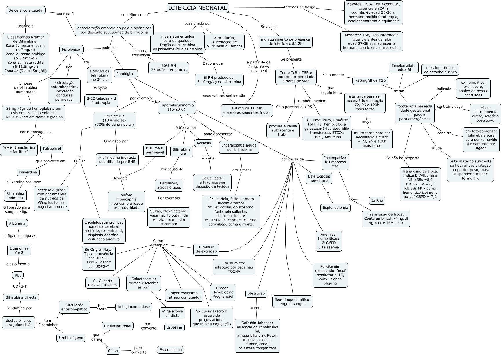 Esse mapa conceitual, produzido no IHMC CmapTools, tem a informação relacionada a: INCTERICIA NEONATAL, Fisiológico Por >circulação enterohepática. <excreção condutas permeável, Hiperbilirrubinemia (15-20%) é tóxica por Bilirrubina livre, descoloração amarela da pele e apêndices por depósito subcutâneo de bilirrubina con una frecuencia 60% RN 75-80% prematuros, Urobilinógeno que deriva Cirulación renal, De cefálico a caudal Usando a Classificando Kramer de Bilirrubina: Zona 1: hasta el cuello (4-7mg/dl) Zona 2: hasta ombligo (5-8.5mg/dl) Zona 3: hasta rodilla (6-11.5mg/dl) Zona 4: (9 a ᡇmg/dl), ICTERICIA NEONATAL ocasionado por níveis aumentados soro de qualquer fração de bilirrubina os primeiros 28 dias de vida, Patológico por exemplo Hiperbilirrubinemia (15-20%), Incompatível RH materno fetal TX Ig Rho, fototerapia baseada idade gestacional sem passar para emergências indicado ex hemolítico, prematuro, abaixo do peso e contusões, Patológico por causa de Causa mista: infecção por bacalhau TOCHA, ᡑmg/dl de TSB tratar metaloporfirinas de estanho e zinco, níveis aumentados soro de qualquer fração de bilirrubina os primeiros 28 dias de vida Dado a que El RN produce de 6-10mg/kg de bilirrubina, Urobilinógeno que deriva Cólon, Patológico por causa de Diminuir de excreção, Biliverdina biliverdina redutase Bilirrubina indirecta, REL UDPG-T Bilirrubina directa, 35mg x1gr de hemoglobina em o sistema reticuloendotelial MΘ é clivado em heme e globina Por Hemoxigenasa Tetrapirrol, Fisiológico Síntese de bilirrubina aumentado 35mg x1gr de hemoglobina em o sistema reticuloendotelial MΘ é clivado em heme e globina, Fisiológico até 12mg/dl de bilirrubina no 3º dia, Ligandinas Y e Z eles o elem a REL