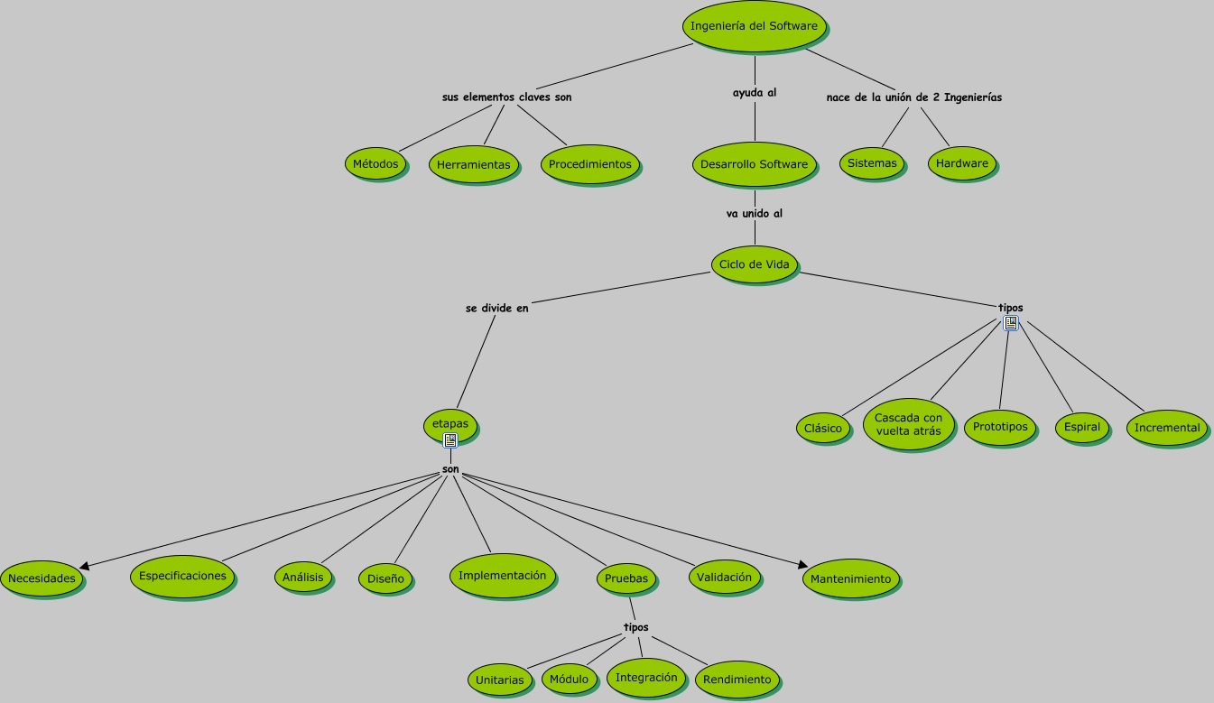 Este Cmap, tiene información relacionada con: Ingenieria del software, etapas son Implementación, Desarrollo Software va unido al Ciclo de Vida, Ciclo de Vida tipos Prototipos, Ingeniería del Software nace de la unión de 2 Ingenierías Sistemas, Ingeniería del Software sus elementos claves son Herramientas, etapas son Validación, etapas son Mantenimiento, Pruebas tipos Módulo, Ingeniería del Software sus elementos claves son Métodos, Pruebas tipos Unitarias, Ciclo de Vida se divide en etapas, Ingeniería del Software nace de la unión de 2 Ingenierías Hardware, etapas son Diseño, Ciclo de Vida tipos Cascada con vuelta atrás, Ingeniería del Software ayuda al Desarrollo Software, Pruebas tipos Rendimiento, etapas son Pruebas, Ciclo de Vida tipos Clásico, etapas son Especificaciones, etapas son Necesidades