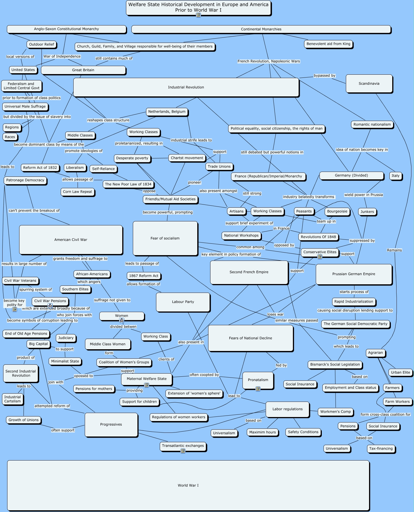 This Concept Map, created with IHMC CmapTools, has information related to: Welfare State 19th Century Development, Labor regulations Maximim hours, Revolutions Of 1848 suppressed by Prussian German Empire, Friendly/Mutual Aid Societies Artisans, Southern Elites who join forces with Judiciary, Reform Act of 1832 allows passage of Corn Law Repeal, Artisans still strong France (Republican/Imperial/Monarchy, Bourgeoisie team up in Revolutions Of 1848, Middle Classes reshapes class structure Working Classes, Labor regulations Safety Conditions, American Civil War grants freedom and suffrage to African-Americans, Industrial Revolution industry belatedly transforms Germany (Divided), Second French Empire loses war Fears of National Decline, Liberalism allows passage of Corn Law Repeal, Continental Monarchies Benevolent aid from King, Labour Party lead to Labor regulations, Women divided betwen Working Class, Trade Unions industrial strife leads to Netherlands, Belgium, Pensions based-on Universalism, Prussian German Empire starts process of Rapid Industrialization, Social Insurance based-on Universalism