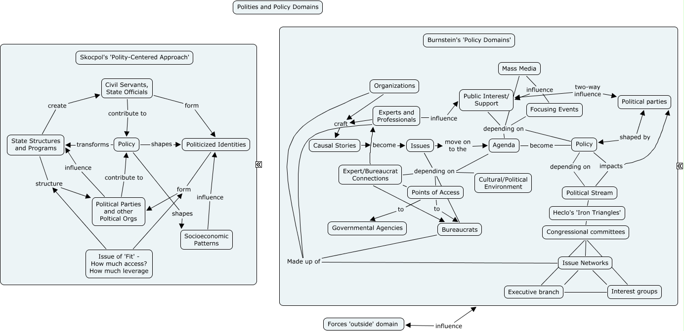 This Concept Map, created with IHMC CmapTools, has information related to: Polities and Policy Domains, Political Parties and other Poltical Orgs influence State Structures and Programs, Policy impacts Political parties, Issue Networks Congressional committees, State Structures and Programs structure Political Parties and other Poltical Orgs, Agenda depending on Expert/Bureaucrat Connections, Issue Networks Made up of Organizations, Issue Networks Interest groups, Causal Stories become Issues, Policy depending on Focusing Events, Interest groups Congressional committees, Issue Networks Made up of Bureaucrats, Civil Servants, State Officials form Politicized Identities, Mass Media influence Public Interest/ Support, Agenda depending on Focusing Events, Issues depending on Cultural/Political Environment, Civil Servants, State Officials contribute to Policy, Policy depending on Mass Media, Executive branch Interest groups, Experts and Professionals craft Causal Stories, Agenda become Policy