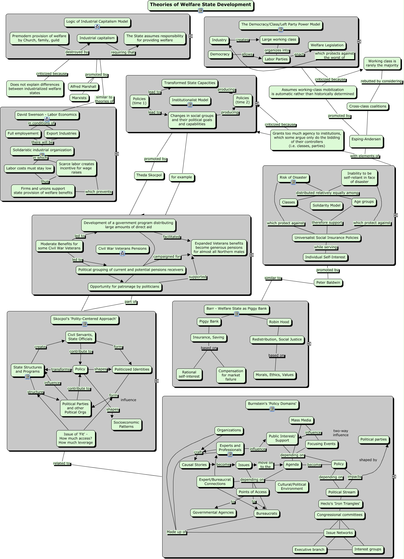 This Concept Map, created with IHMC CmapTools, has information related to: Theories of Welfare State Development, Issue Networks Interest groups, Theda Skocpol ????, Solidaristic industrial organization in which Scarce labor creates incentive for wage raises, Premodern provision of welfare by Church, family, guild destroyed by Industrial capitalism, Issues depending on Expert/Bureaucrat Connections, Policy depending on Mass Media, Large working class organizes into Labor Parties, Issue Networks Congressional committees, Labor Parties enact Welfare Legislation, State Structures and Programs create Civil Servants, State Officials, Welfare Legislation which protects against the worst of Industry, Full employement there will be Solidaristic industrial organization, Redistribution, Social Justice based on Morals, Ethics, Values, Robin Hood Redistribution, Social Justice, Piggy Bank Barr - Welfare State as Piggy Bank, Policy transforms State Structures and Programs, Political grouping of current and potential pensions receivers campaigned for Expanded Veterans benefits become generous pensions for almost all Northern males, Changes in social groups and their political goals and capabilities producing Policies (time 2), State Structures and Programs structure Political Parties and other Poltical Orgs, Agenda depending on Public Interest/ Support