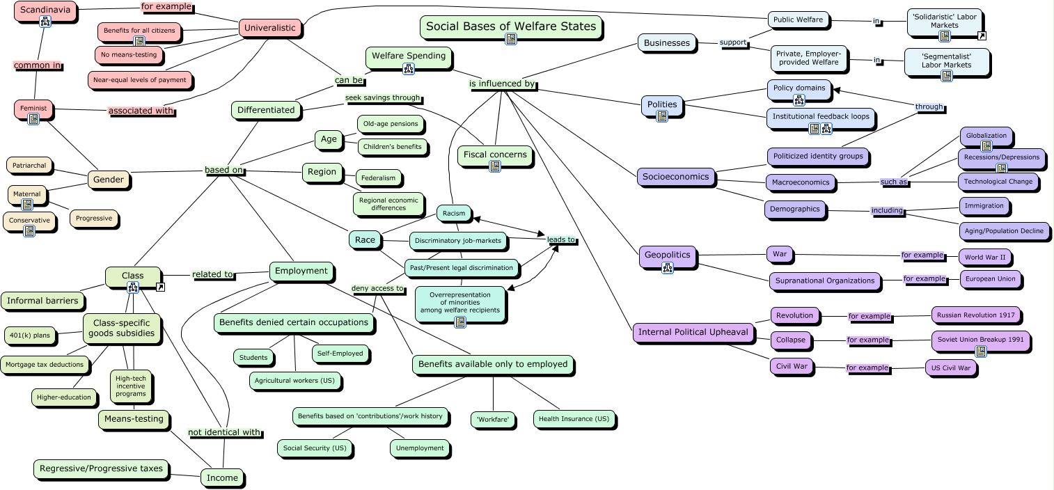 This Concept Map, created with IHMC CmapTools, has information related to: Welfare State Social Bases.cmap, Self-Employed Benefits denied certain occupations, Employment not identical with Income, Revolution for example Russian Revolution 1917, Welfare Spending is influenced by Internal Political Upheaval, Maternal Conservative, Racism is influenced by Businesses, Socioeconomics Demographics, Geopolitics is influenced by Socioeconomics, Racism leads to Discriminatory job-markets, Collapse for example Soviet Union Breakup 1991, Welfare Spending is influenced by Fiscal concerns, Univeralistic for example Scandinavia, Class Class-specific goods subsidies, Welfare Spending is influenced by Polities, Racism is influenced by Internal Political Upheaval, Region Regional economic differences, Differentiated based on Gender, Businesses support Private, Employer- provided Welfare, Politicized identity groups through Policy domains, Geopolitics War