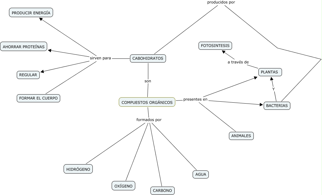 Este Cmap, tiene información relacionada con: CABOHIDRATOS, COMPUESTOS ORGÁNICOS formados por CARBONO, COMPUESTOS ORGÁNICOS presentes en ANIMALES, PLANTAS a través de FOTOSINTESIS, CABOHIDRATOS producidos por BACTERIAS, CABOHIDRATOS sirven para PRODUCIR ENERGÍA, CABOHIDRATOS son COMPUESTOS ORGÁNICOS, CABOHIDRATOS sirven para FORMAR EL CUERPO, COMPUESTOS ORGÁNICOS formados por HIDRÓGENO, COMPUESTOS ORGÁNICOS presentes en BACTERIAS, COMPUESTOS ORGÁNICOS presentes en PLANTAS, COMPUESTOS ORGÁNICOS formados por OXÍGENO, CABOHIDRATOS sirven para AHORRAR PROTEÍNAS, BACTERIAS Y PLANTAS, COMPUESTOS ORGÁNICOS formados por AGUA, CABOHIDRATOS sirven para REGULAR